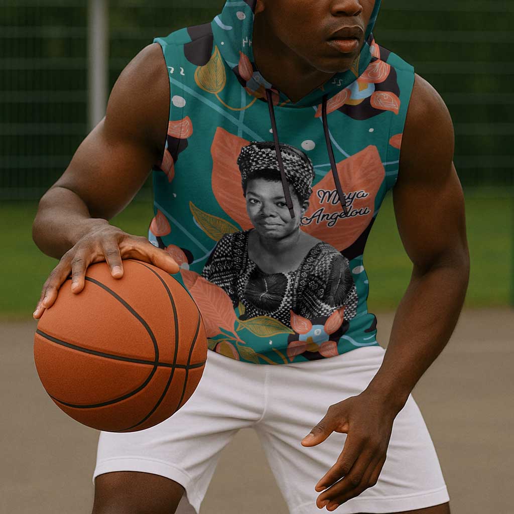Maya Angelou Sleeveless Hoodie Inspirational Quote Design Vibrant Teal and Orange Leaf Motif