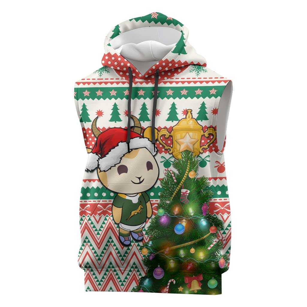 Personalized South Africa Rugby Christmas Sleeveless Hoodie with Cute Springbok and Christmas Tree