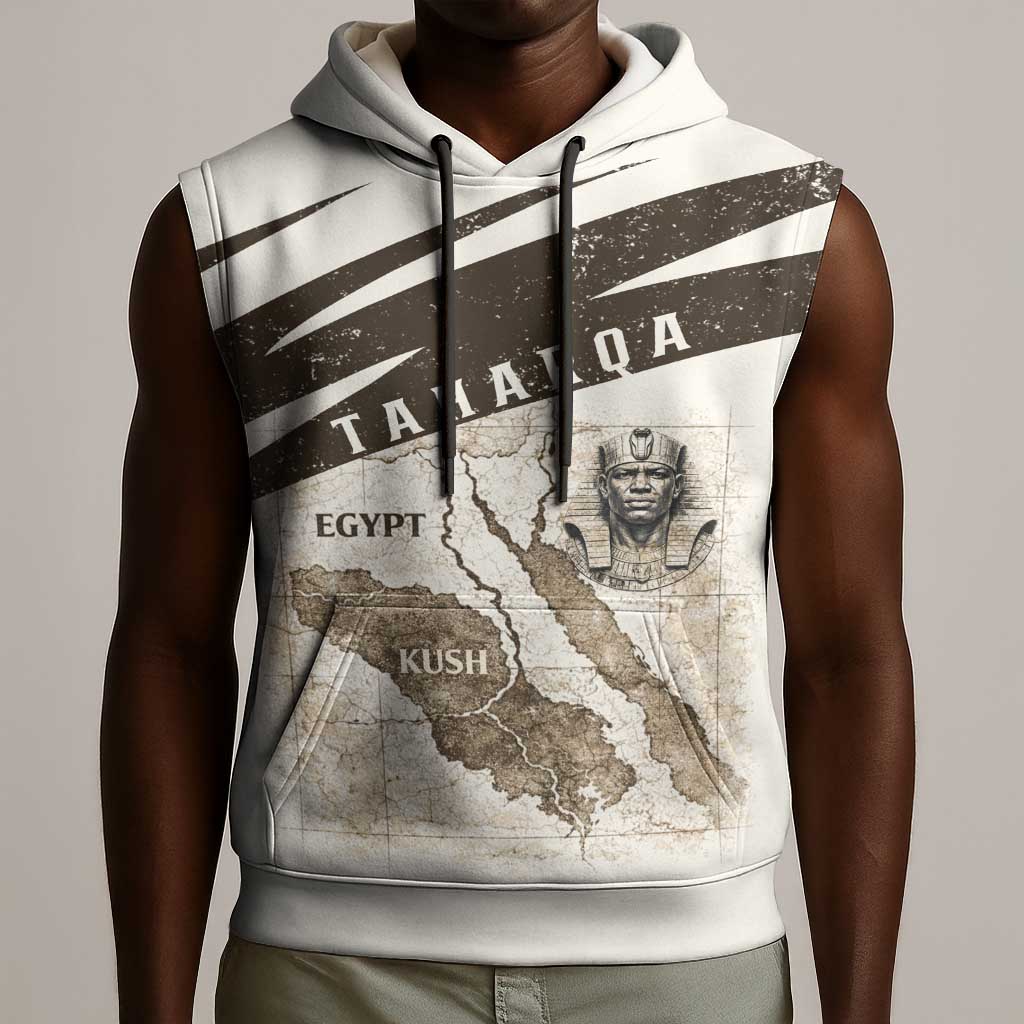 Taharqa Sleeveless Hoodie with Ancient Map Illustration, King of Two Lands Title and Kush Egypt Temple