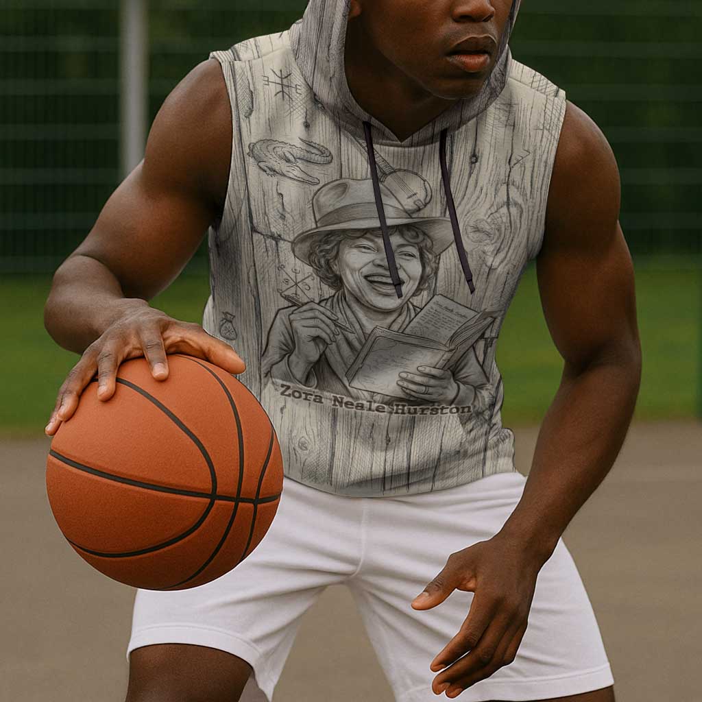 Zora Neale Hurston Sleeveless Hoodie Rustic Wood Engraved Style Illustration Joyful Portrait with Book and Map Donkey TS04