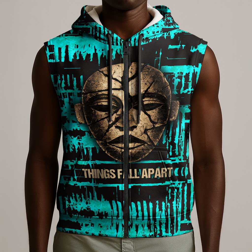 Chinua Achebe Sleeveless Zip Hoodie with Tribal Mask Design, Things Fall Apart Quote and Teal Abstract
