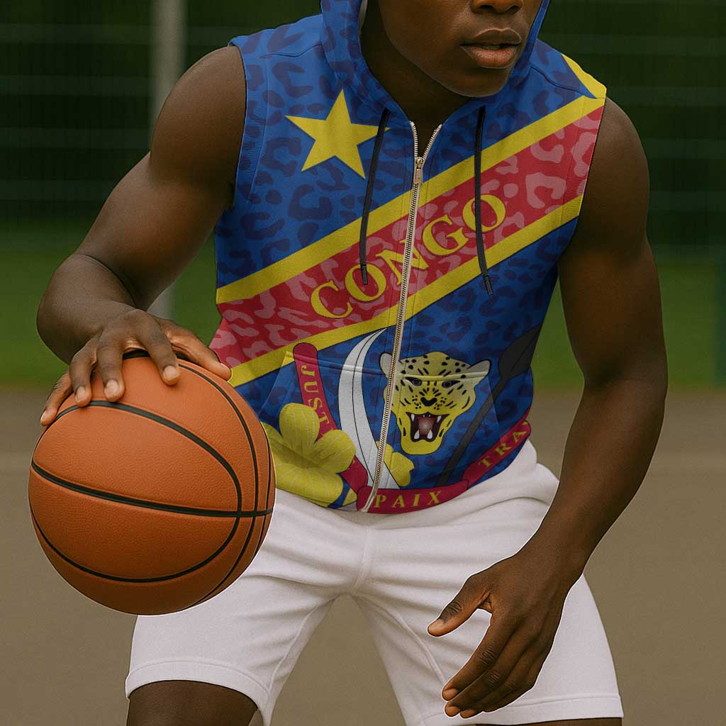 Congo DR Sleeveless Zip Hoodie Coat Of Arms Leopard Pattern