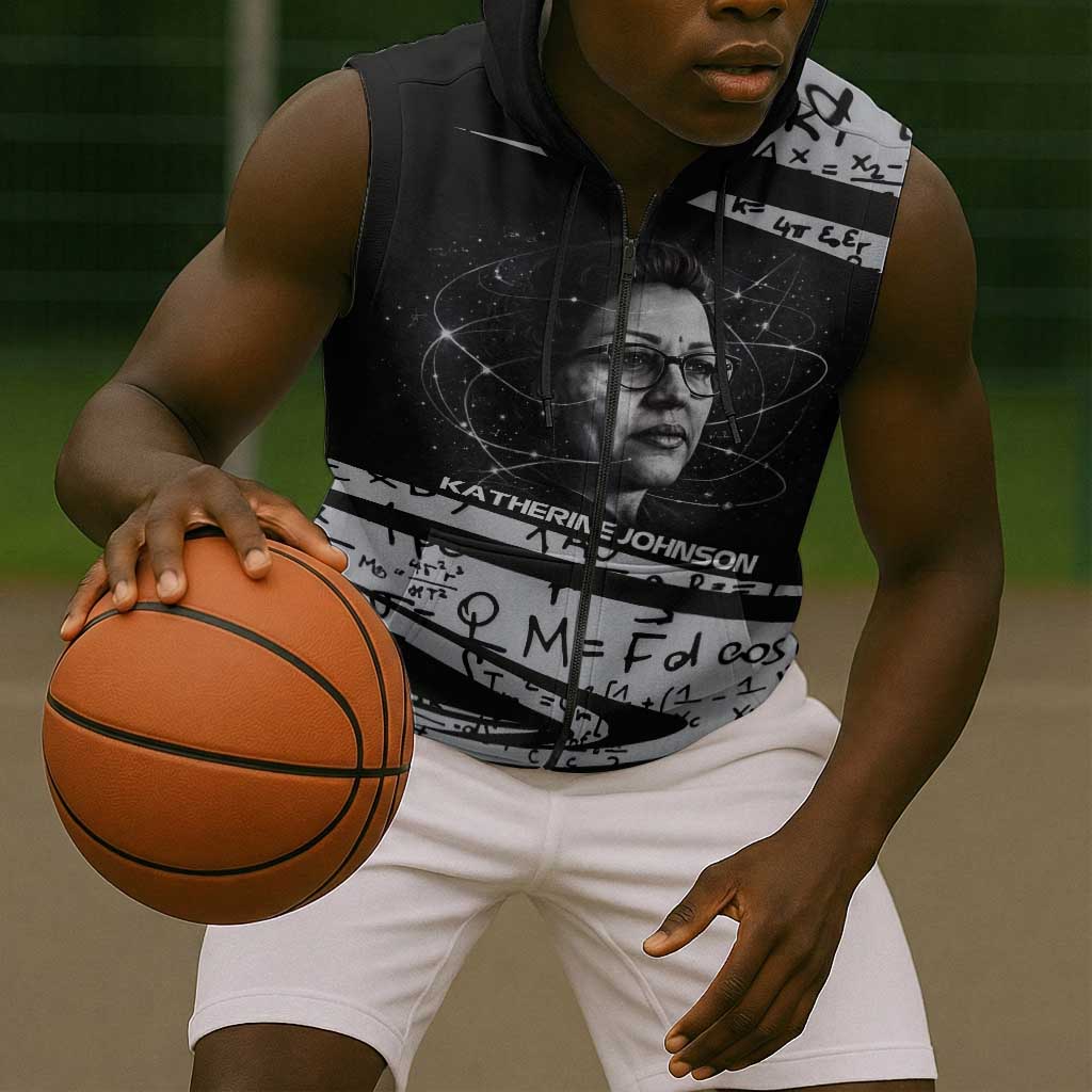 Katherine Johnson Sleeveless Zip Hoodie with Orbital Space Portrait, Historic NASA Launch Dates and Physics