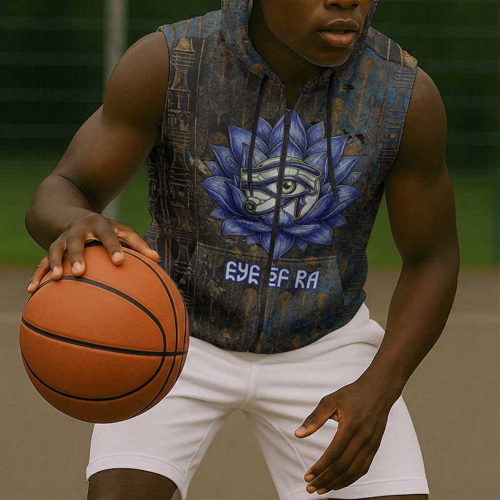 Khepri Ancient Egyptian Sleeveless Zip Hoodie Dark Hieroglyphic, Blue Lotus Eye Symbol, and Winged Scarab Resurrection