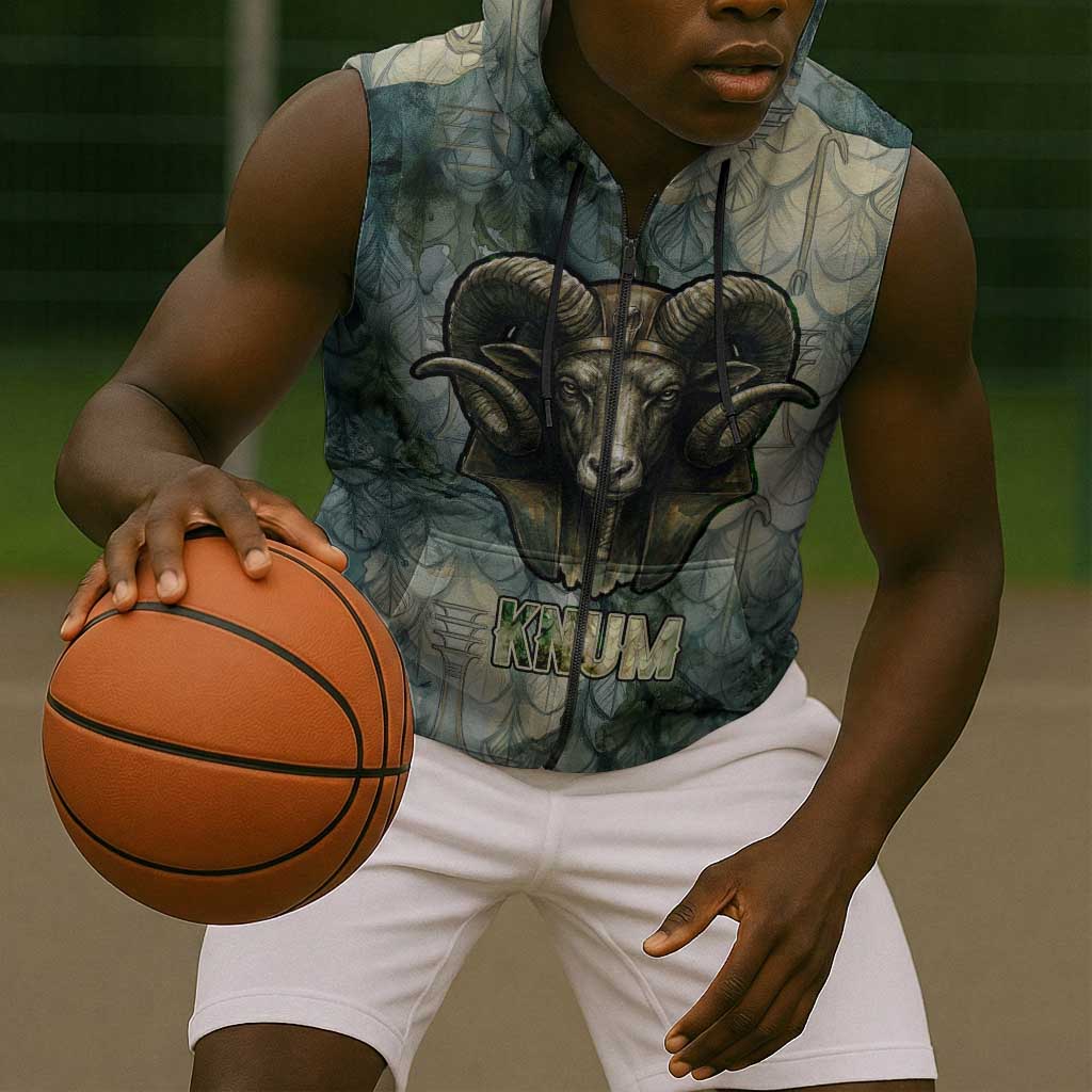 Khnum Ancient Egyptian Sleeveless Zip Hoodie with Smoky Leaf, Ram Head Emblem, and Guardian of the Cataract