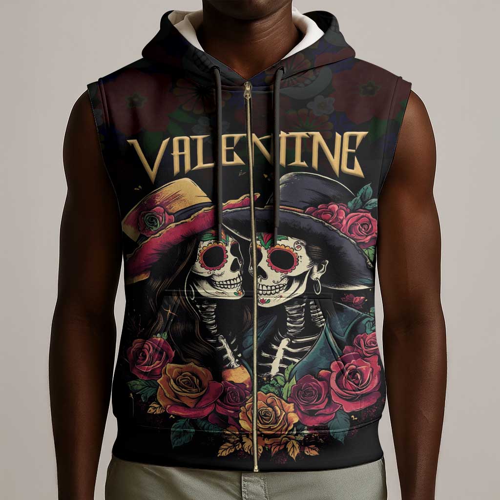 Personalised Sugar Skull Couple Valentine Sleeveless Zip Hoodie Roses Romantic Love