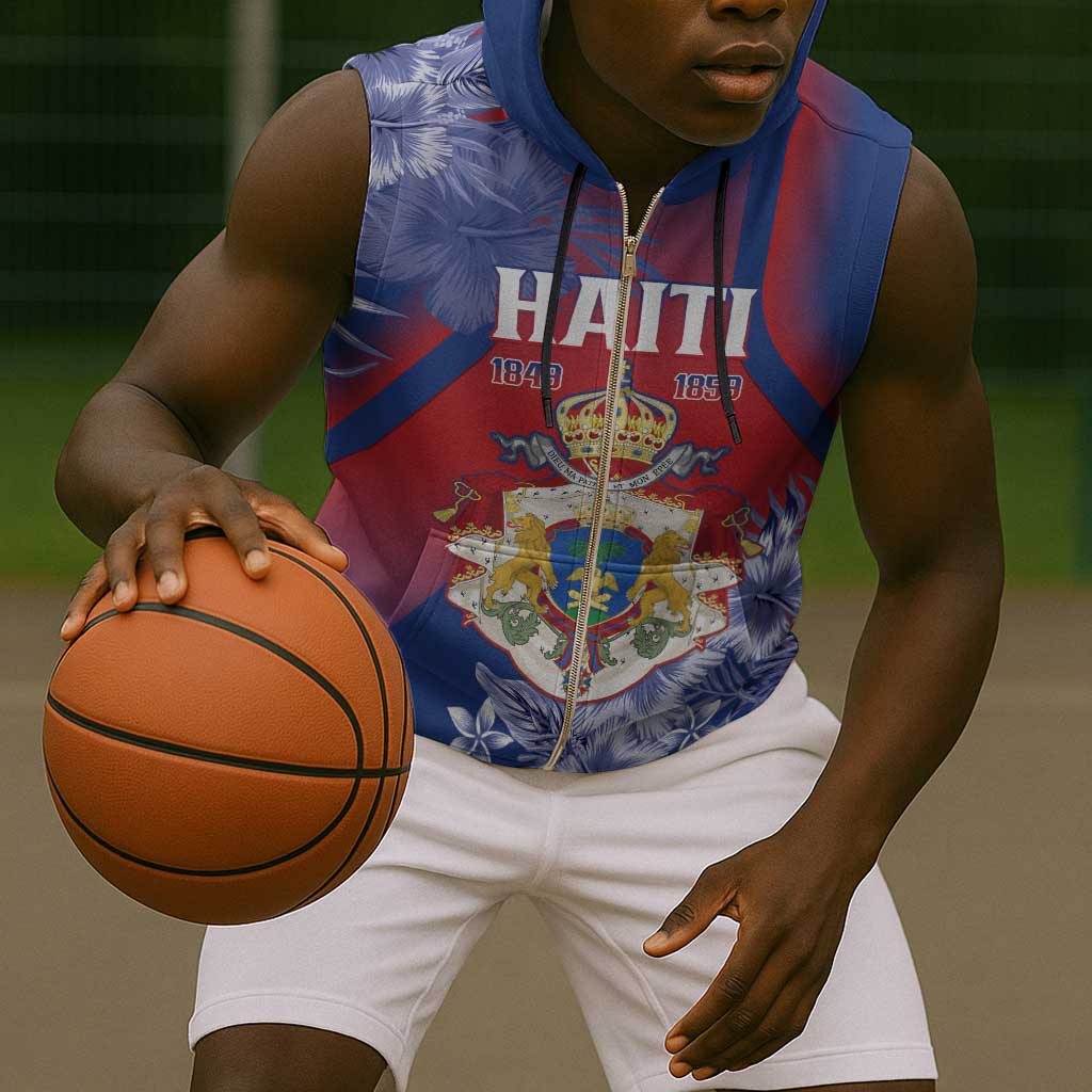 Personalized Second Anpi an Ayiti Sleeveless Zip Hoodie Imperial Haiti Coat Of Arms Tropical Flowers