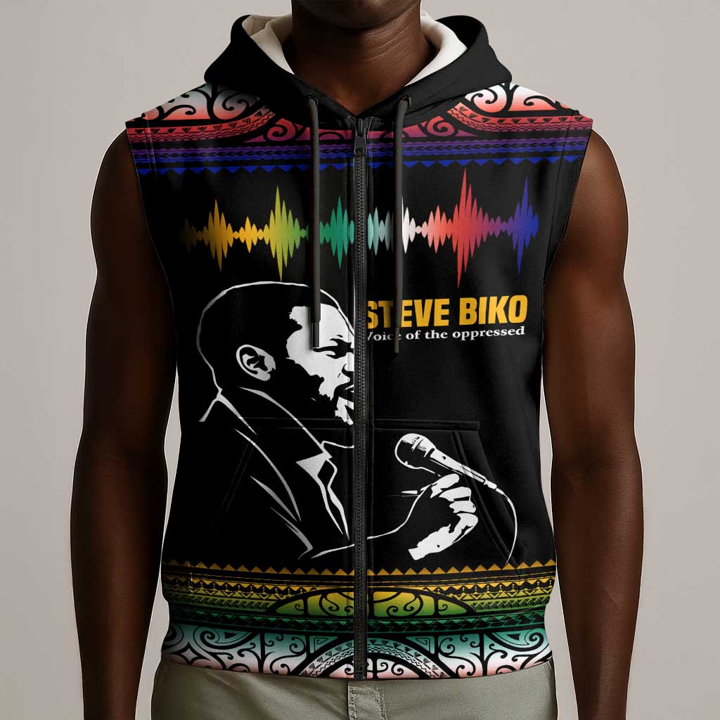 Steve Biko Sleeveless Zip Hoodie with Microphone Portrait, Black Consciousness Quote and Vibrant Ethnic Wave TS04
