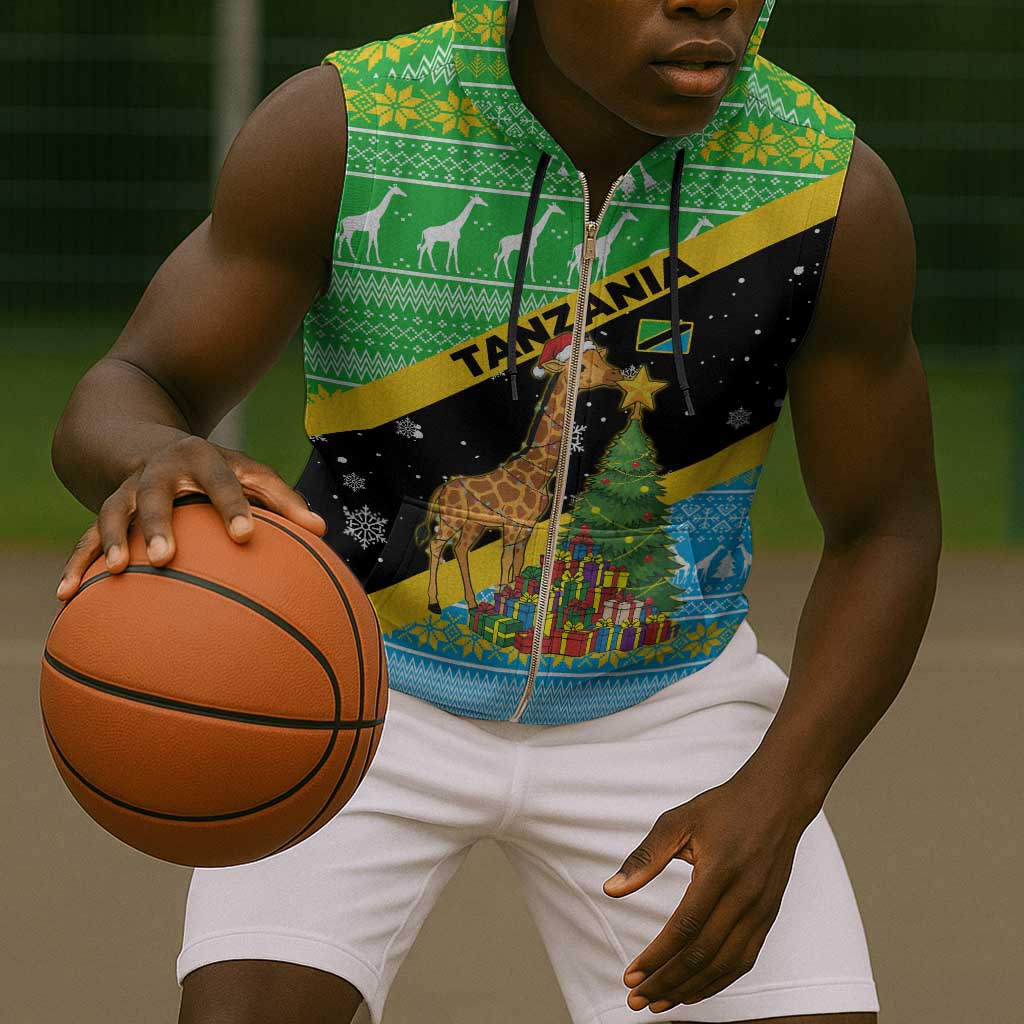Tanzania Christmas Sleeveless Zip Hoodie Giraffe Christmas Tree Snowflakes and Flag