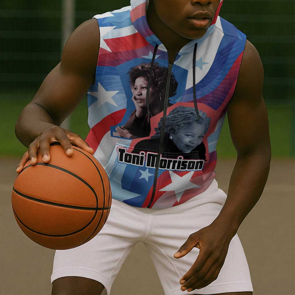 Toni Morrison Sleeveless Zip Hoodie Abstract Wings Design Empowering Quote Dual Portrait Celebration of Literary Freedom