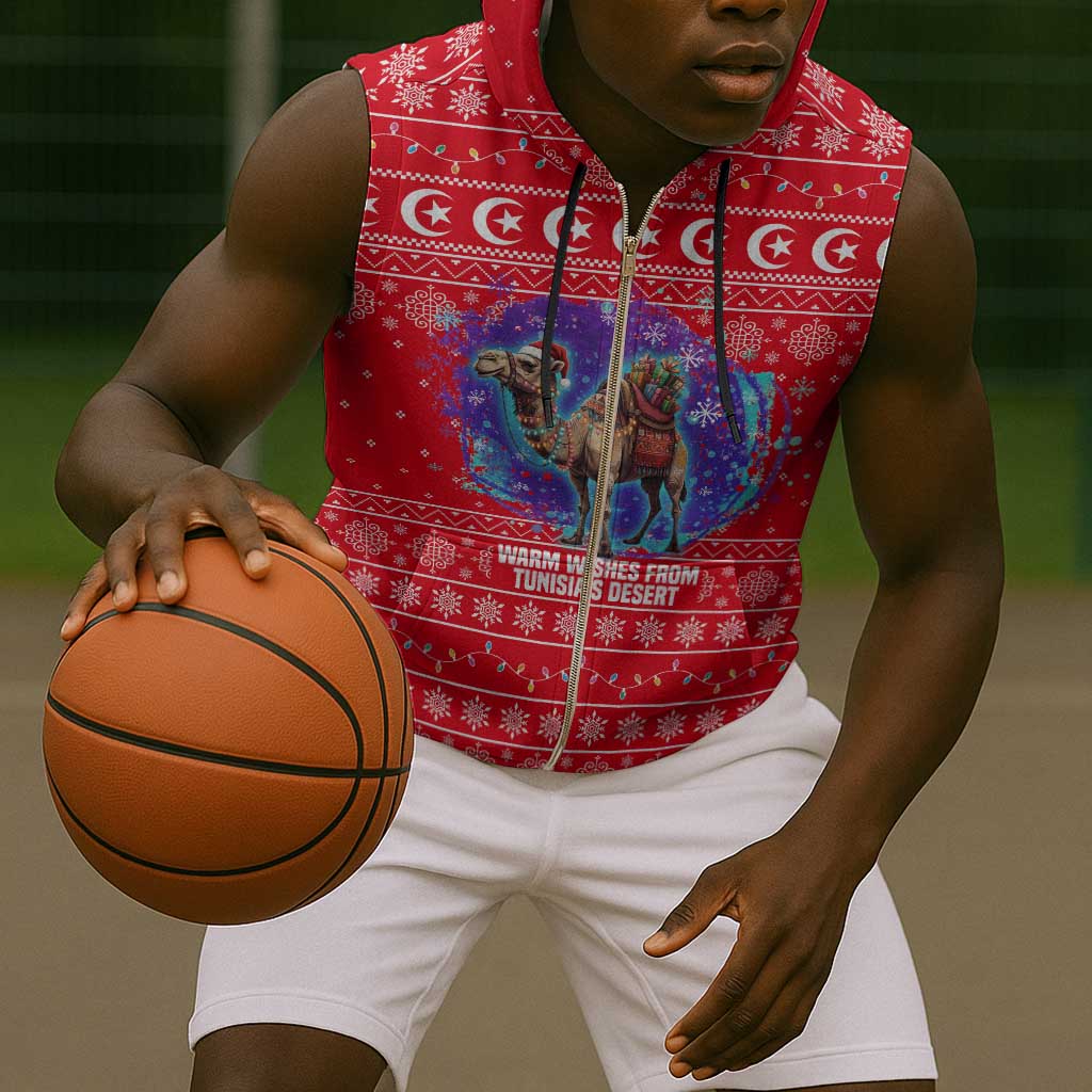 Tunisia Christmas Sleeveless Zip Hoodie Desert Camel Crescent Snowflake Pattern TS04