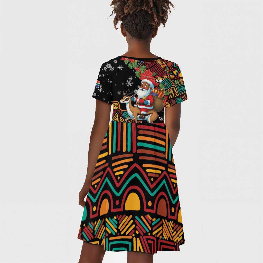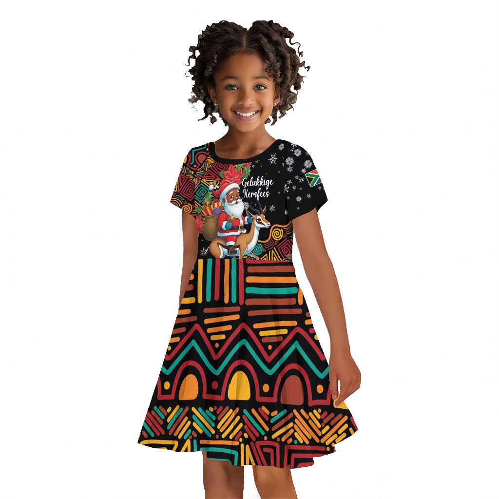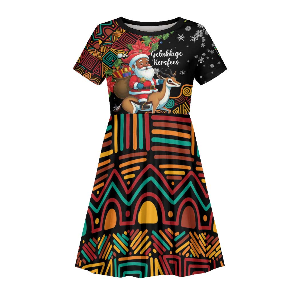 South Africa Gelukkige Kersfees Kid Short Sleeve Dress Black Santa Claus Riding Springbok
