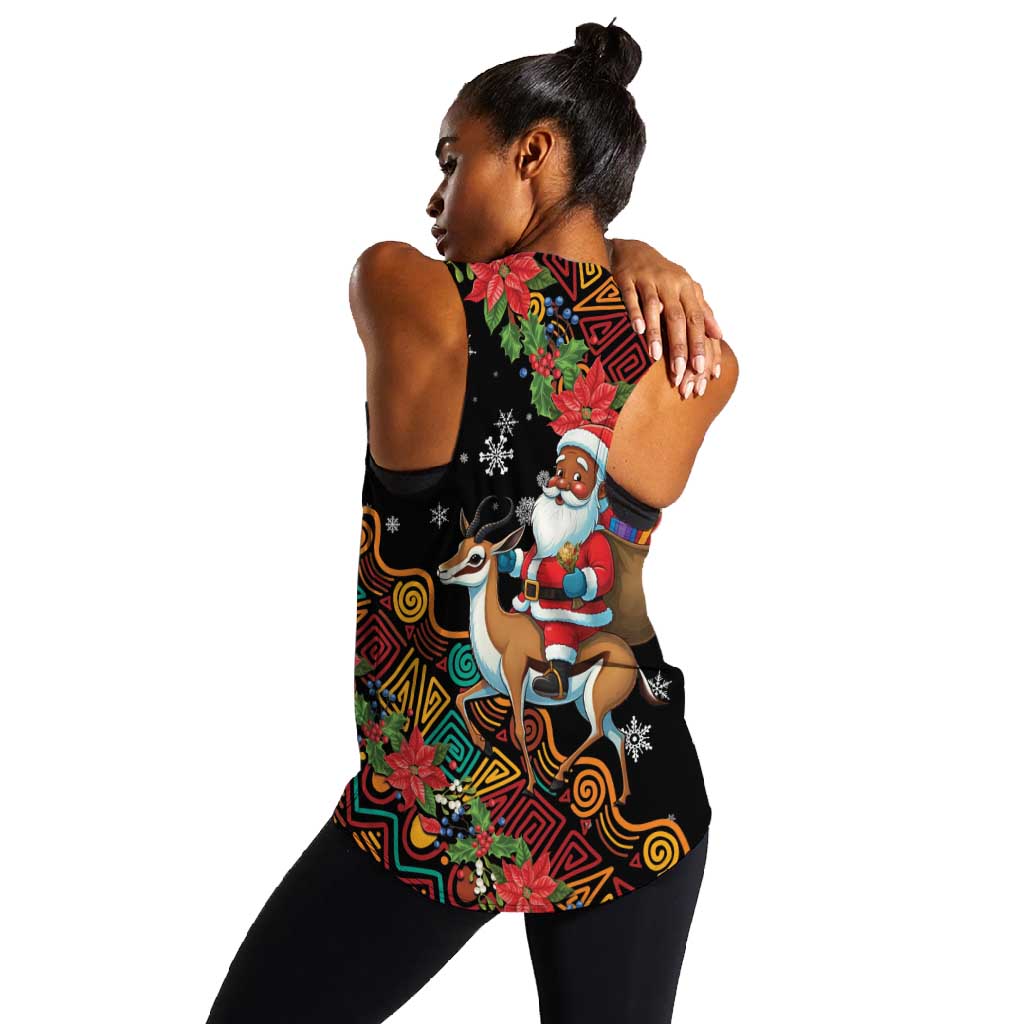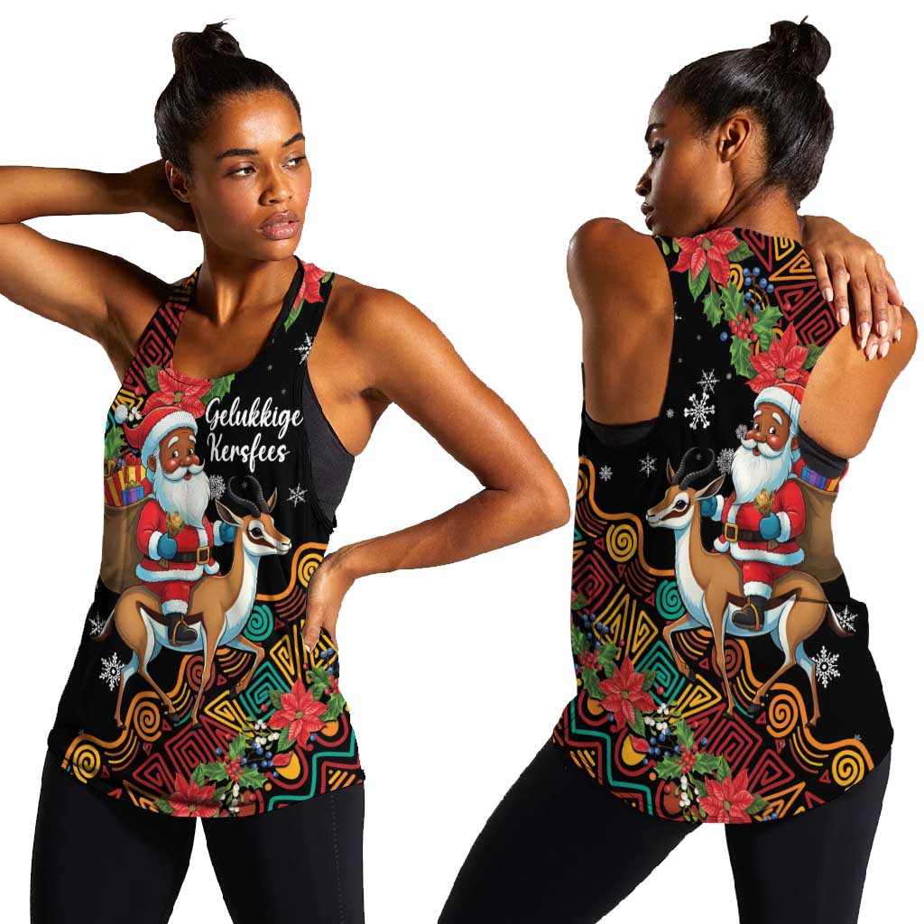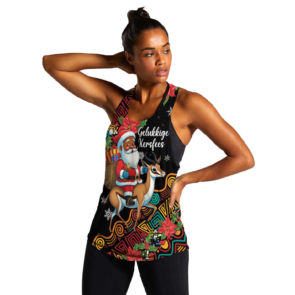 South Africa Gelukkige Kersfees Women Racerback Tank Black Santa Claus Riding Springbok