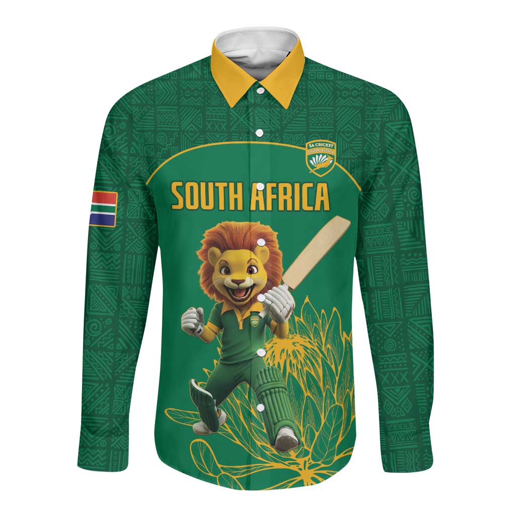 Custom South Africa Long Sleeve Button Shirt Lion Mascot Proteas Cricket