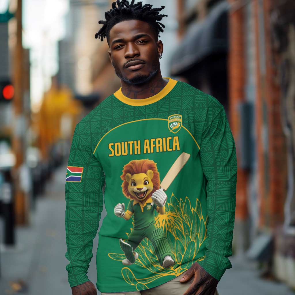 Custom South Africa Long Sleeve Shirt Lion Mascot Proteas Cricket