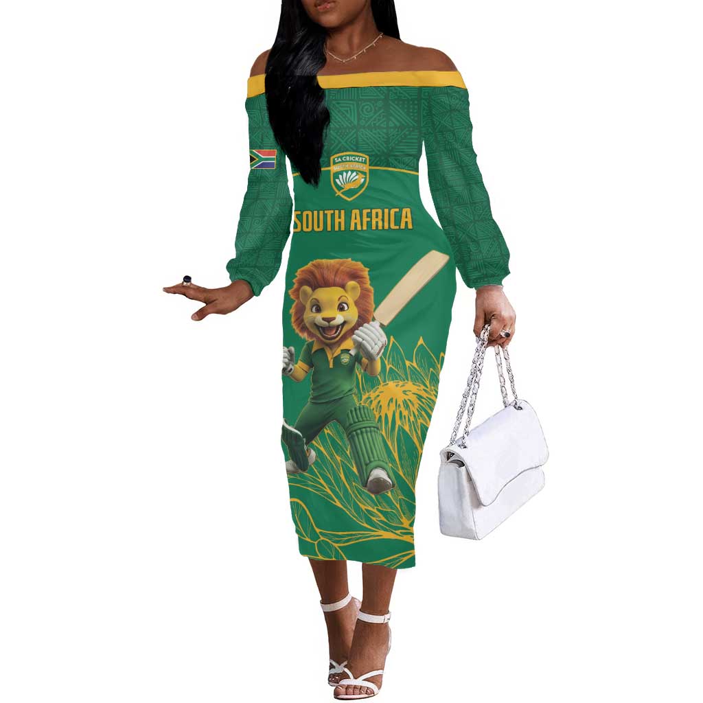Custom South Africa Off The Shoulder Long Sleeve Dress Lion Mascot Proteas Cricket