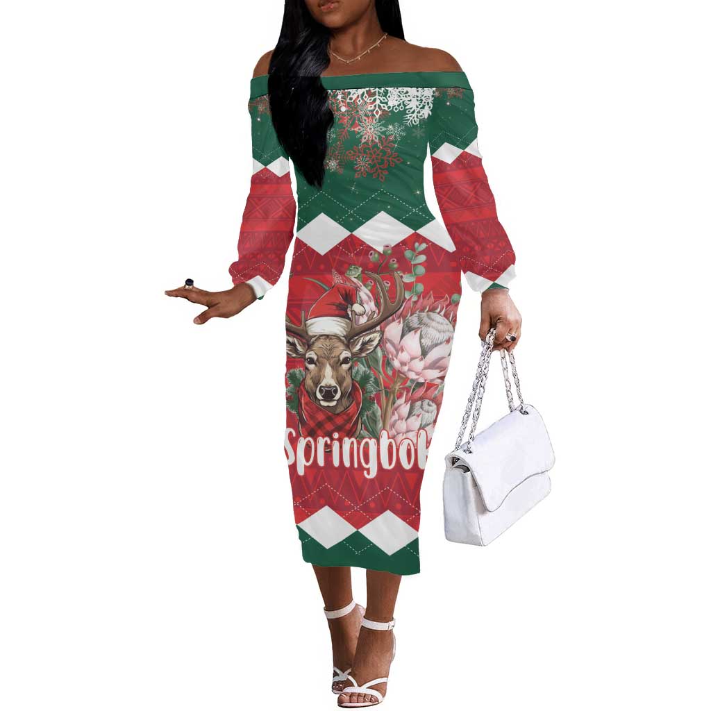 Personalized South Africa Merry Christmas Off The Shoulder Long Sleeve Dress Springbok With King Protea