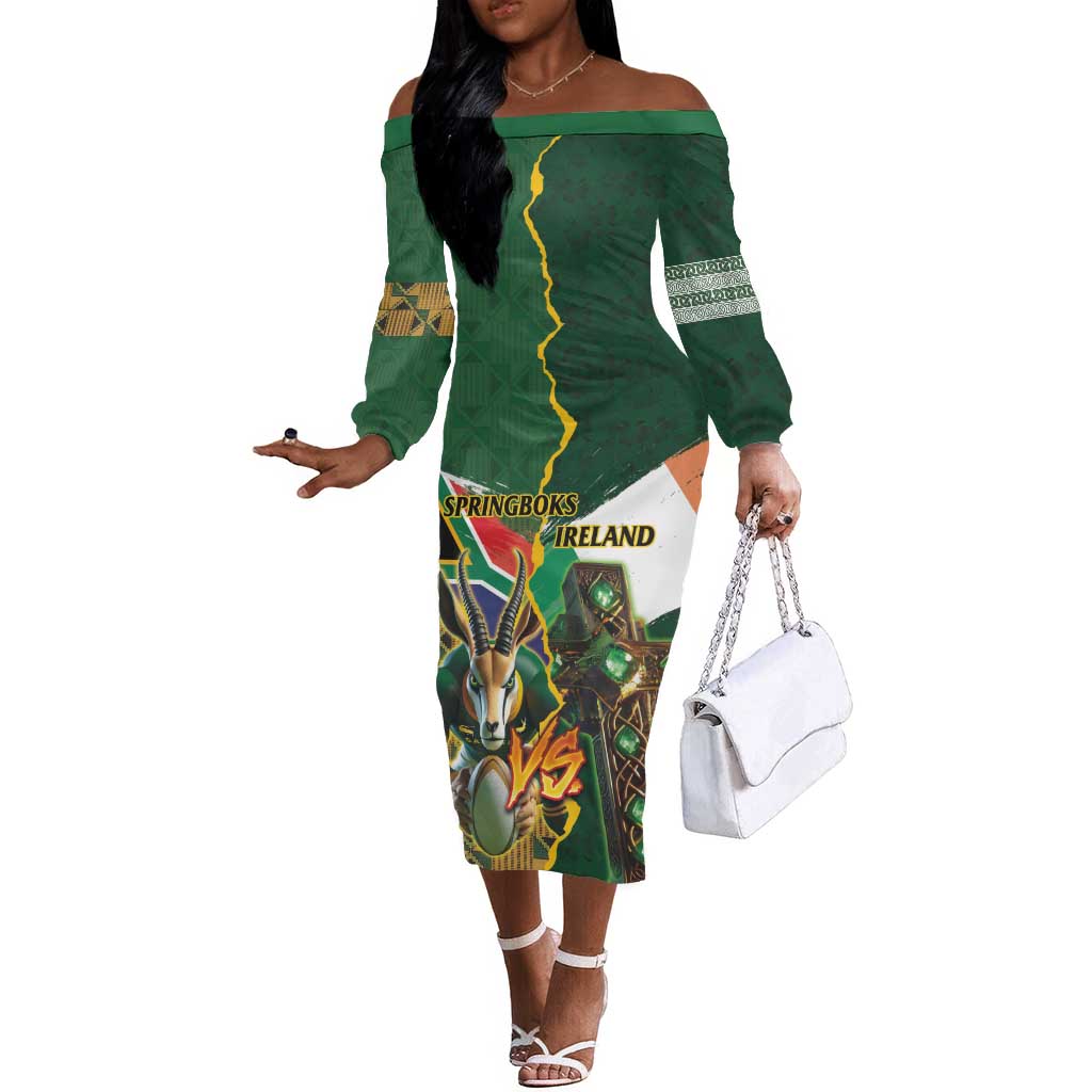 Personalized South Africa Versus Ireland Rugby Off The Shoulder Long Sleeve Dress - Springbok Mascot, Celtic Cross Design