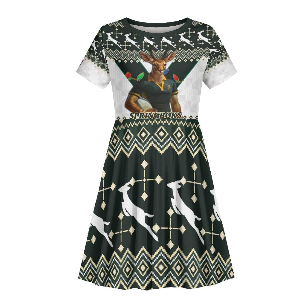 South Africa Christmas Rugby Kid Short Sleeve Dress Springboks Mascot Mix African Pattern LT15