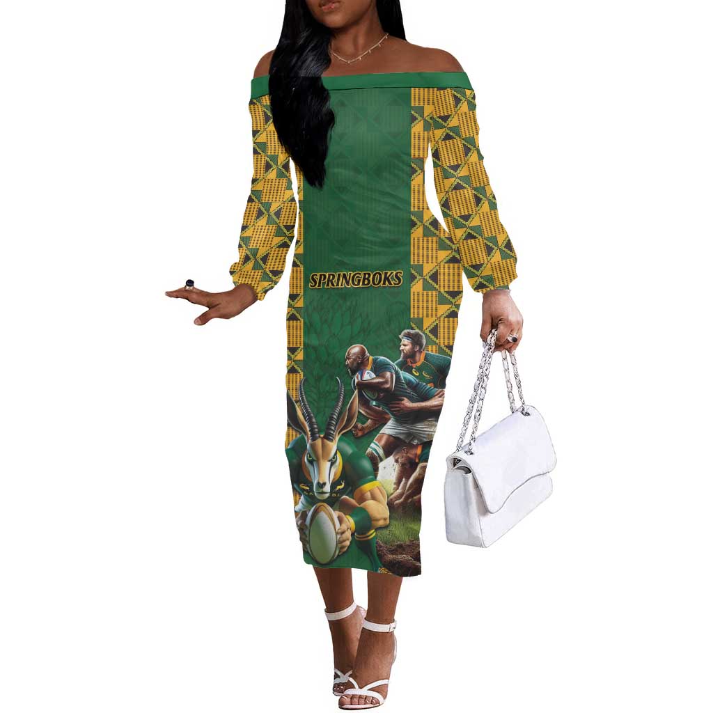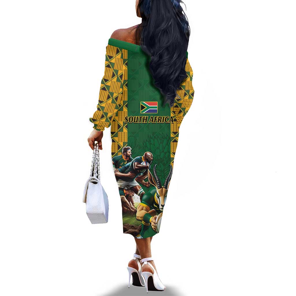 South Africa Rugby Off The Shoulder Long Sleeve Dress - Springbok Mascot, Players Fighting for Victory
