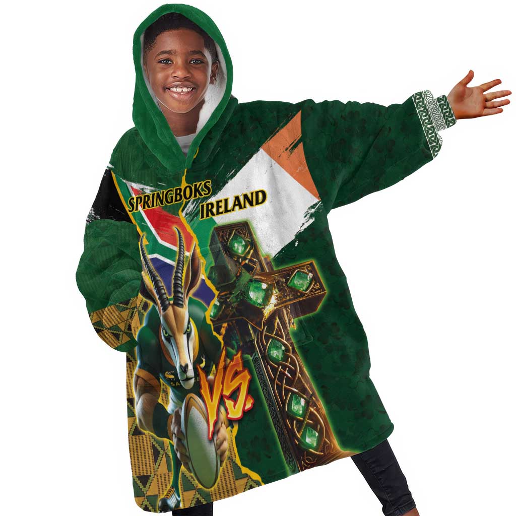 Personalized South Africa Versus Ireland Rugby Kid Wearable Blanket Hoodie - Springbok Mascot, Celtic Cross Design LT03