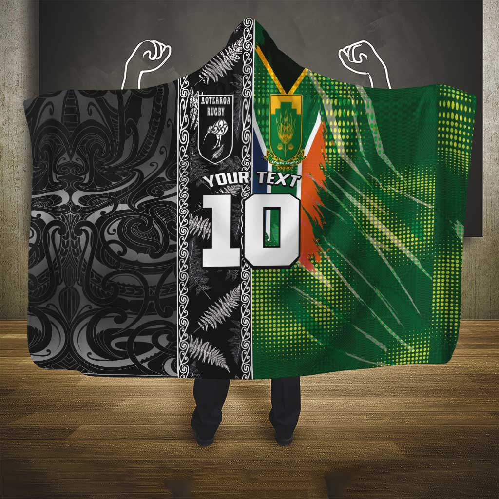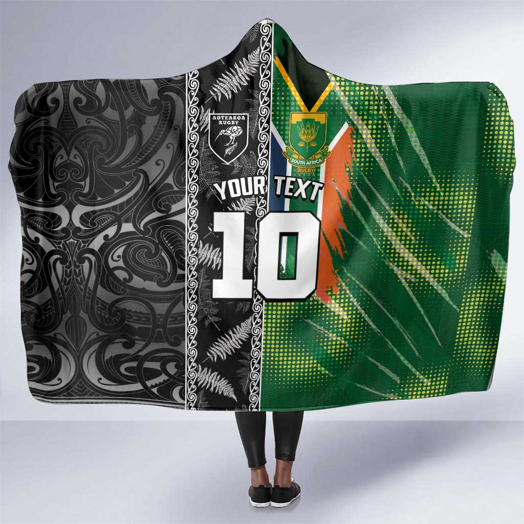 Custom Aotearoa South Africa Rugby Freedom Cup Hooded Blanket Maori Silver Fern Art and Sporty Flag SA