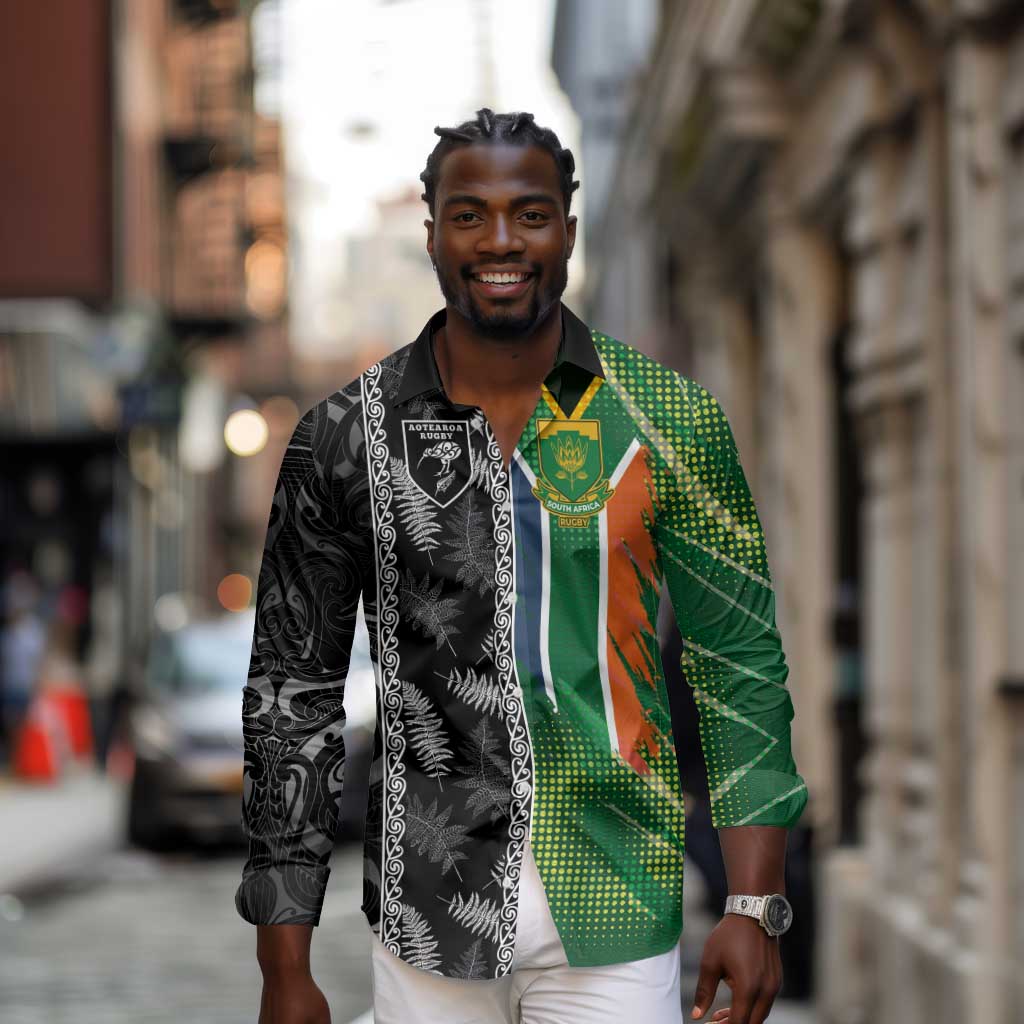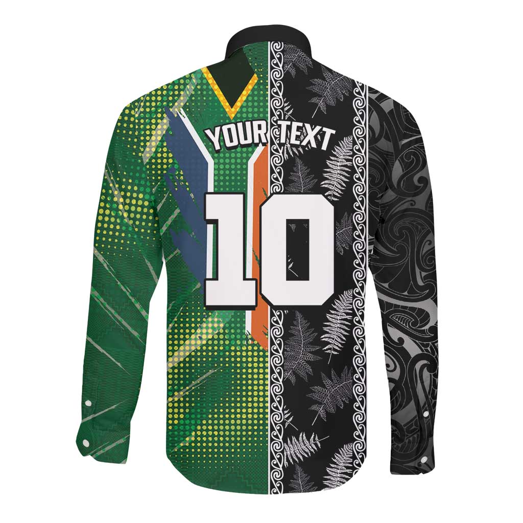 Custom Aotearoa South Africa Rugby Freedom Cup Long Sleeve Button Shirt Maori Silver Fern Art and Sporty Flag SA