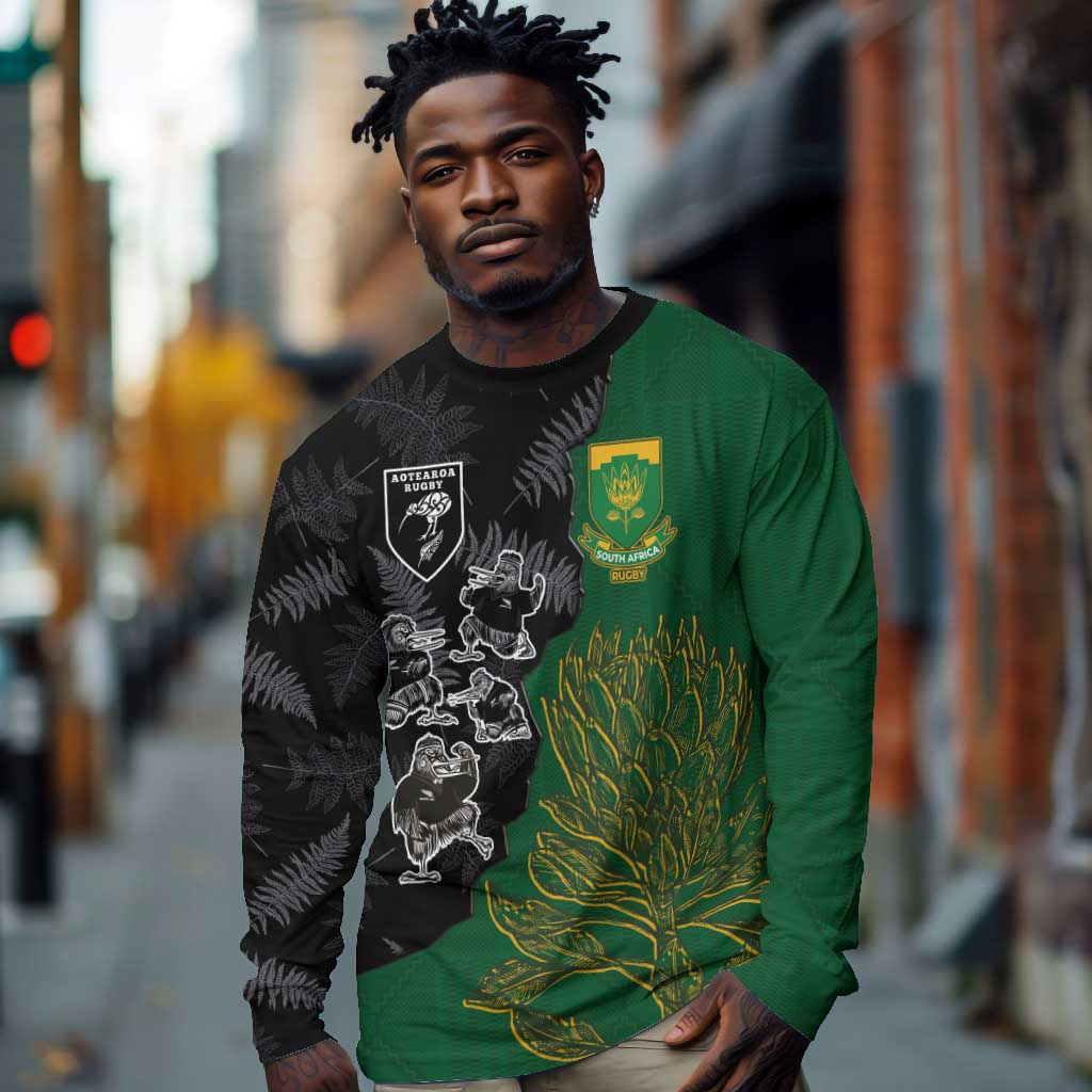 Custom Aotearoa South Africa Rugby Freedom Cup Long Sleeve Shirt Kiwi Warriors Haka with King Protea Symbol