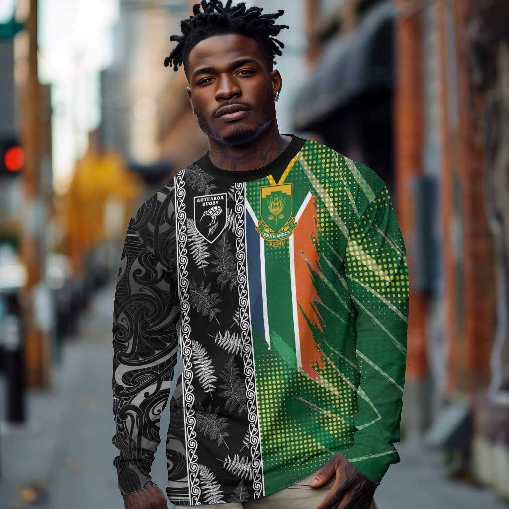Custom Aotearoa South Africa Rugby Freedom Cup Long Sleeve Shirt Maori Silver Fern Art and Sporty Flag SA