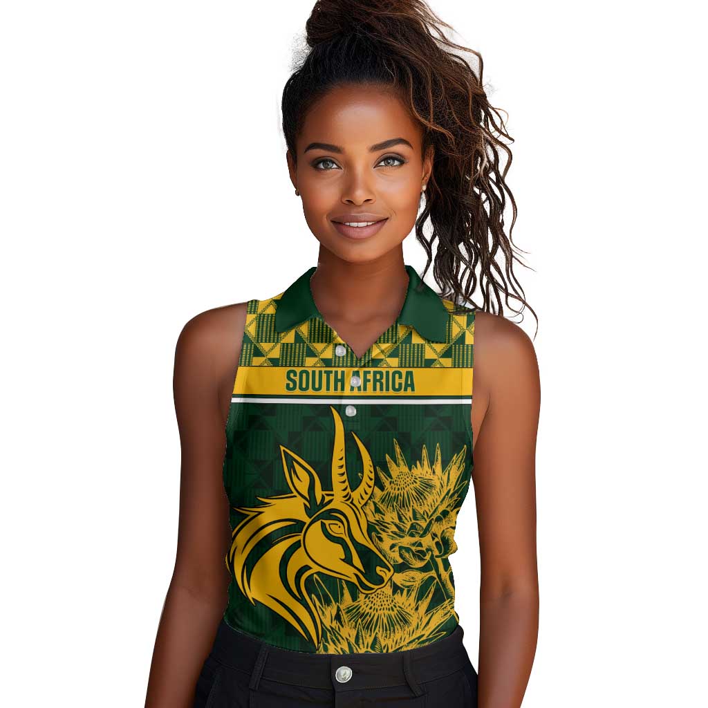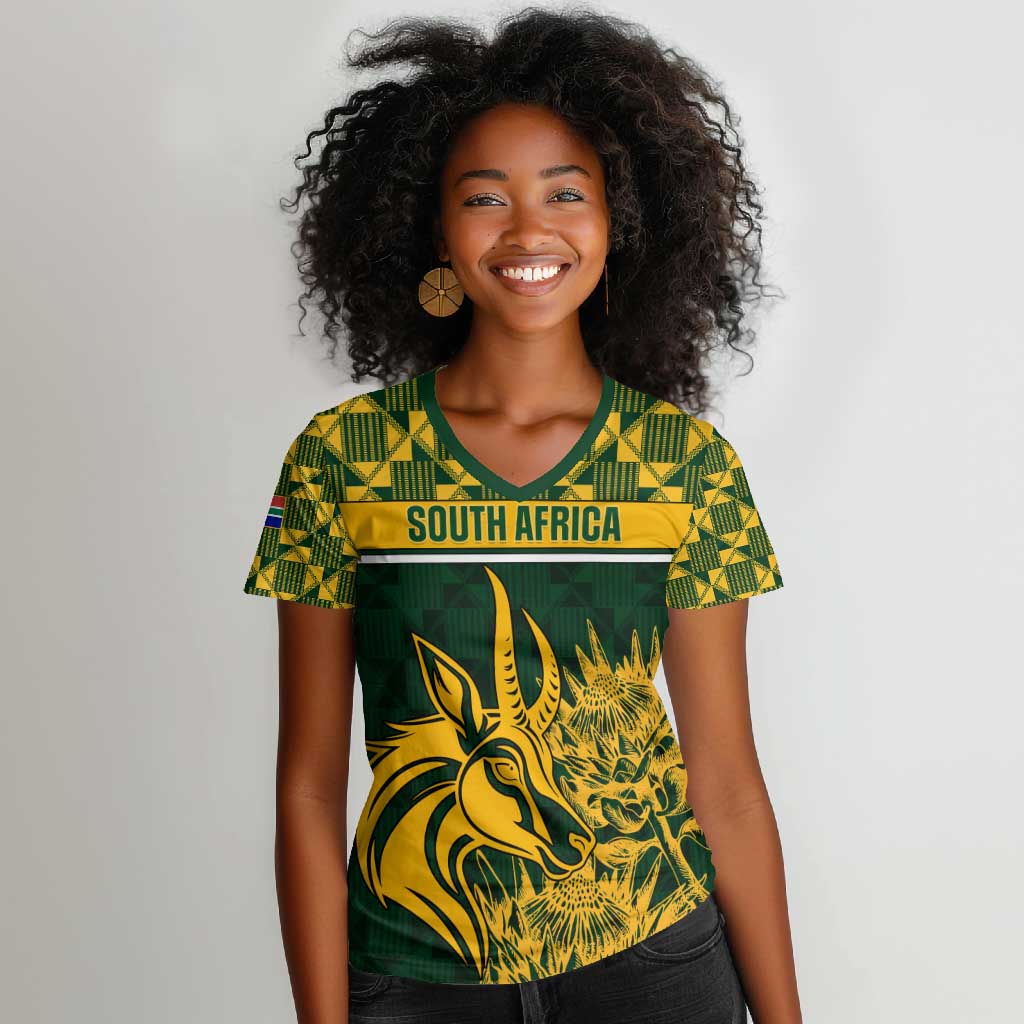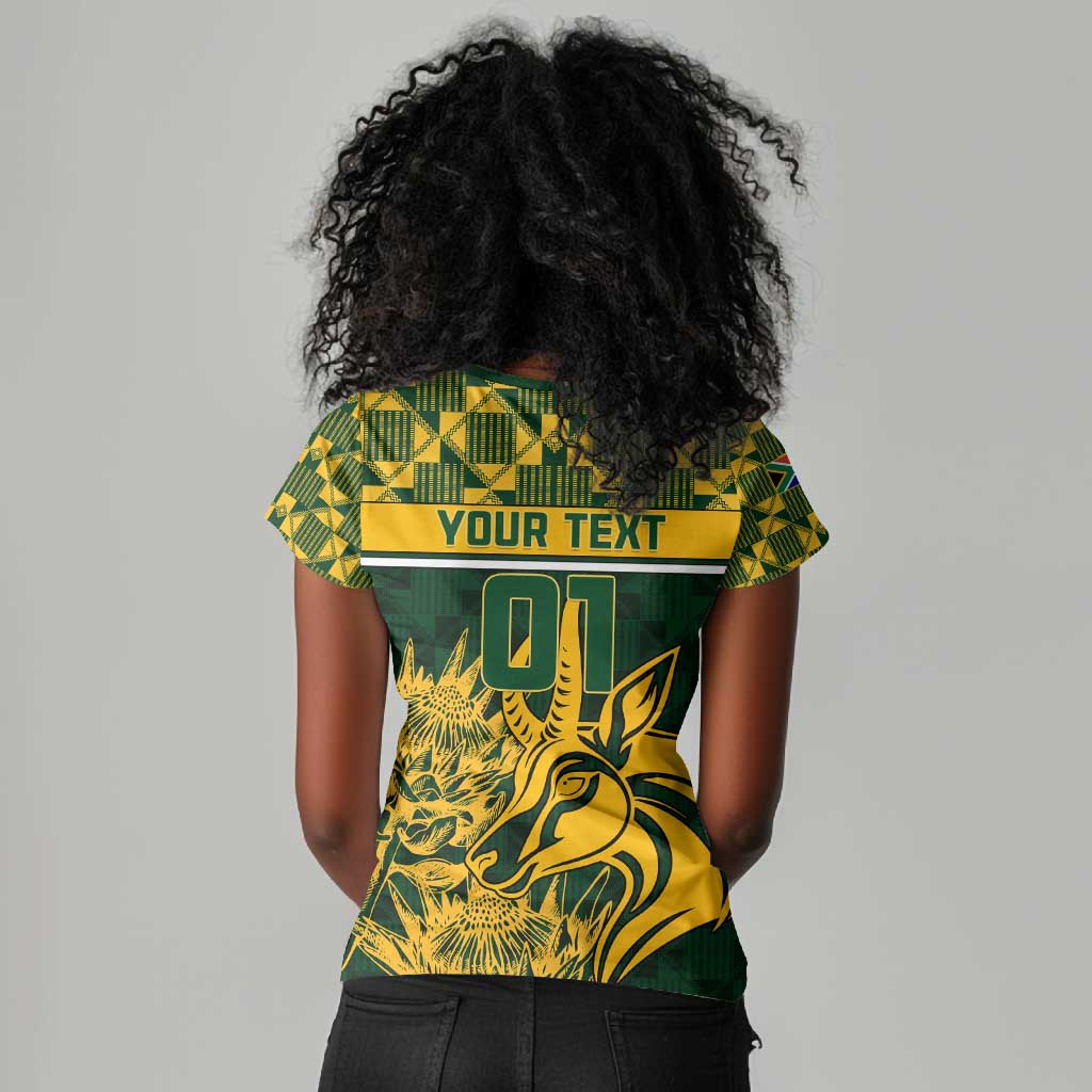 Custom South Africa Rugby Women V-Neck T-Shirt - Go Springboks with African Pattern