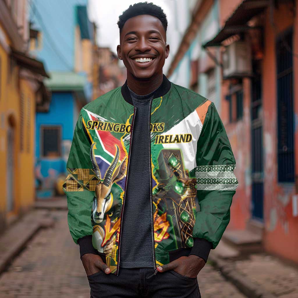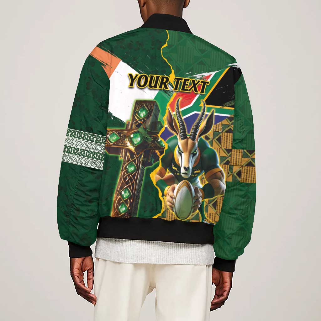 Personalized South Africa Versus Ireland Rugby Bomber Jacket - Springbok Mascot, Celtic Cross Design