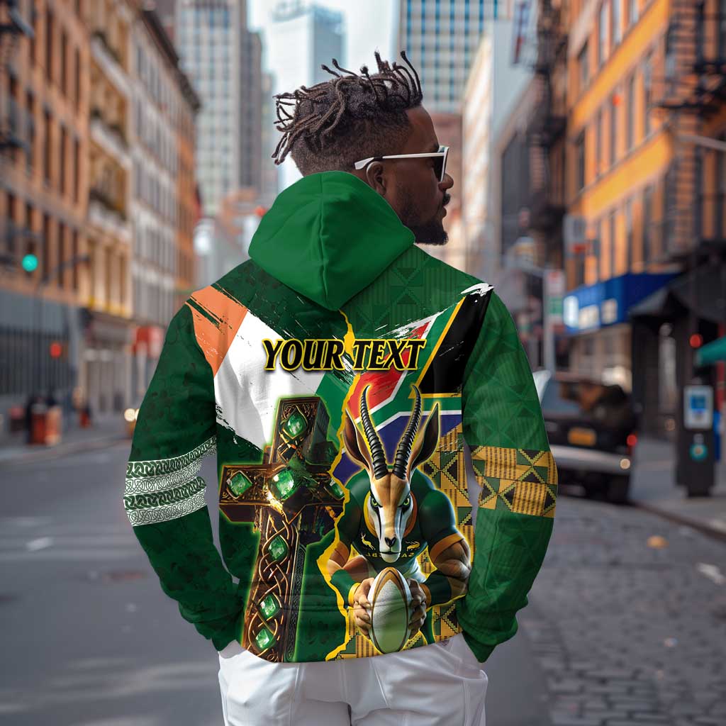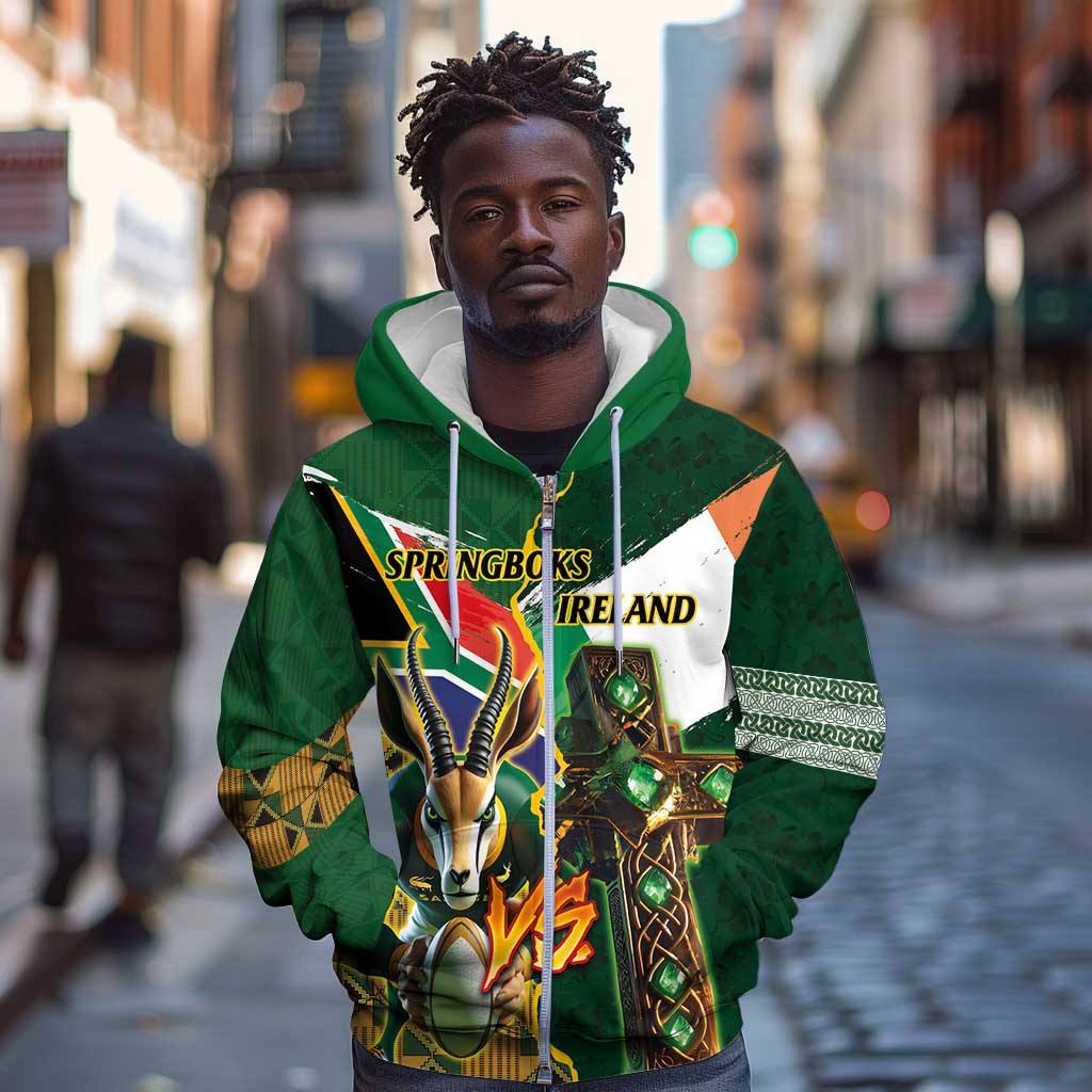 Personalized South Africa Versus Ireland Rugby Zip Hoodie - Springbok Mascot, Celtic Cross Design