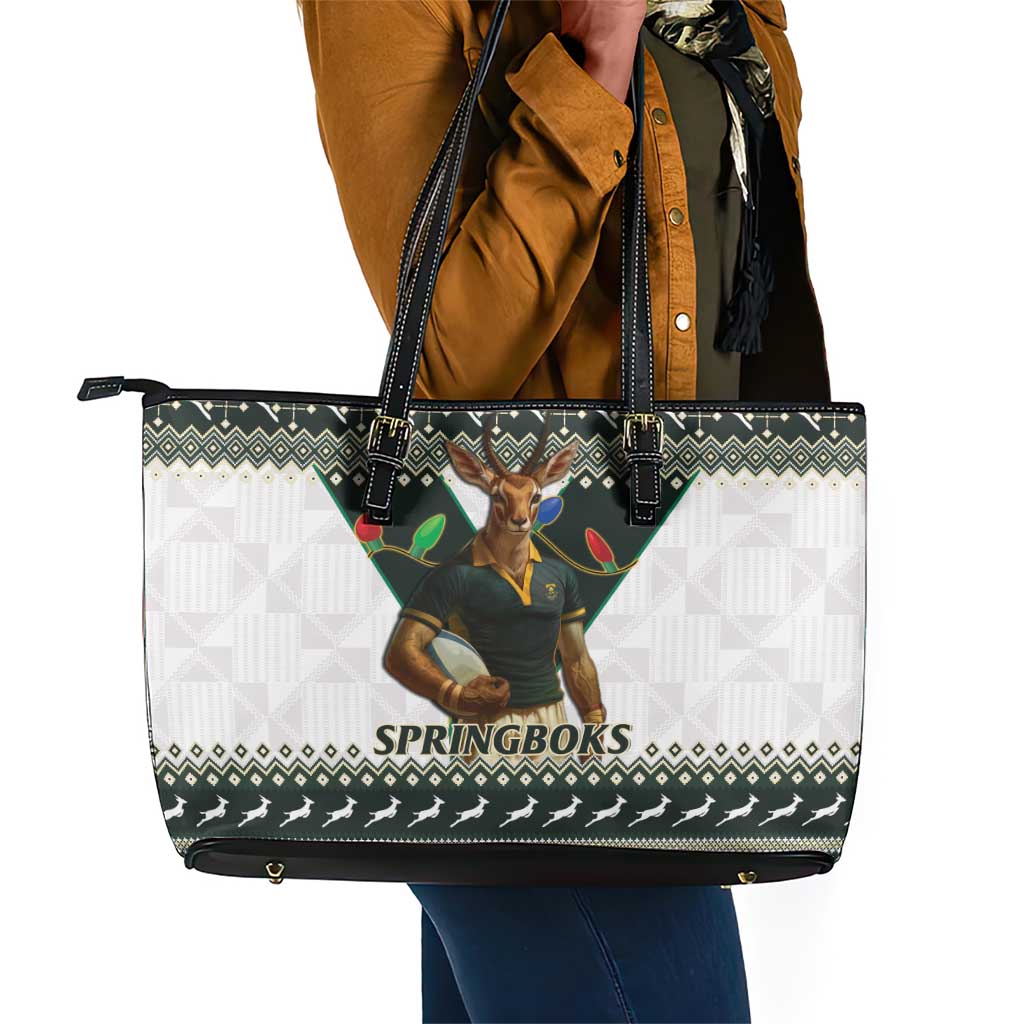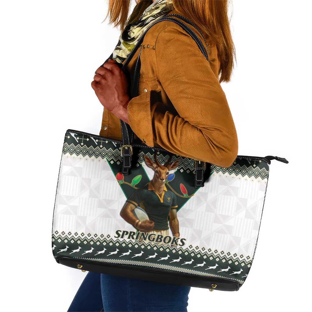 South Africa Christmas Rugby Leather Tote Bag Springboks Mascot Mix African Pattern