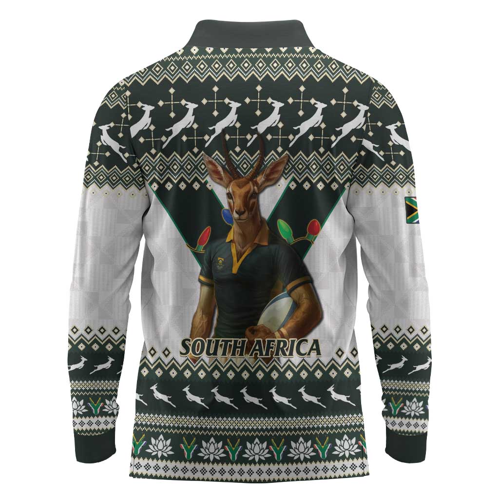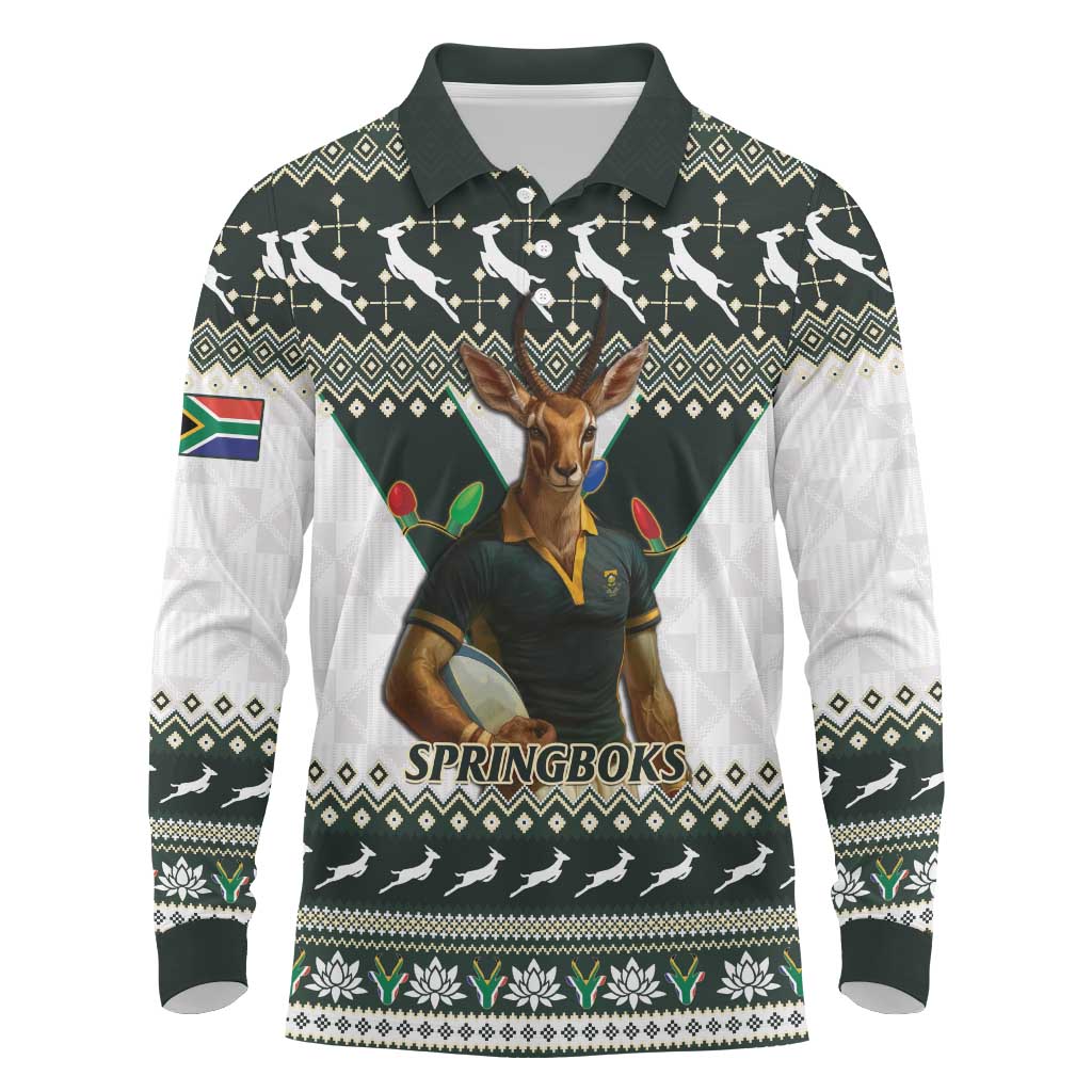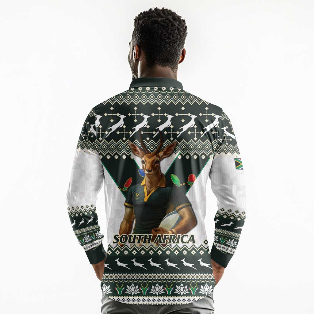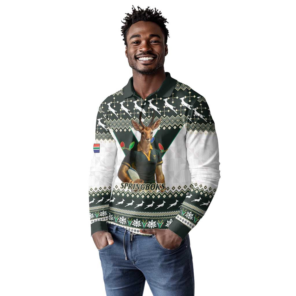 South Africa Christmas Rugby Long Sleeve Polo Shirt Springboks Mascot Mix African Pattern