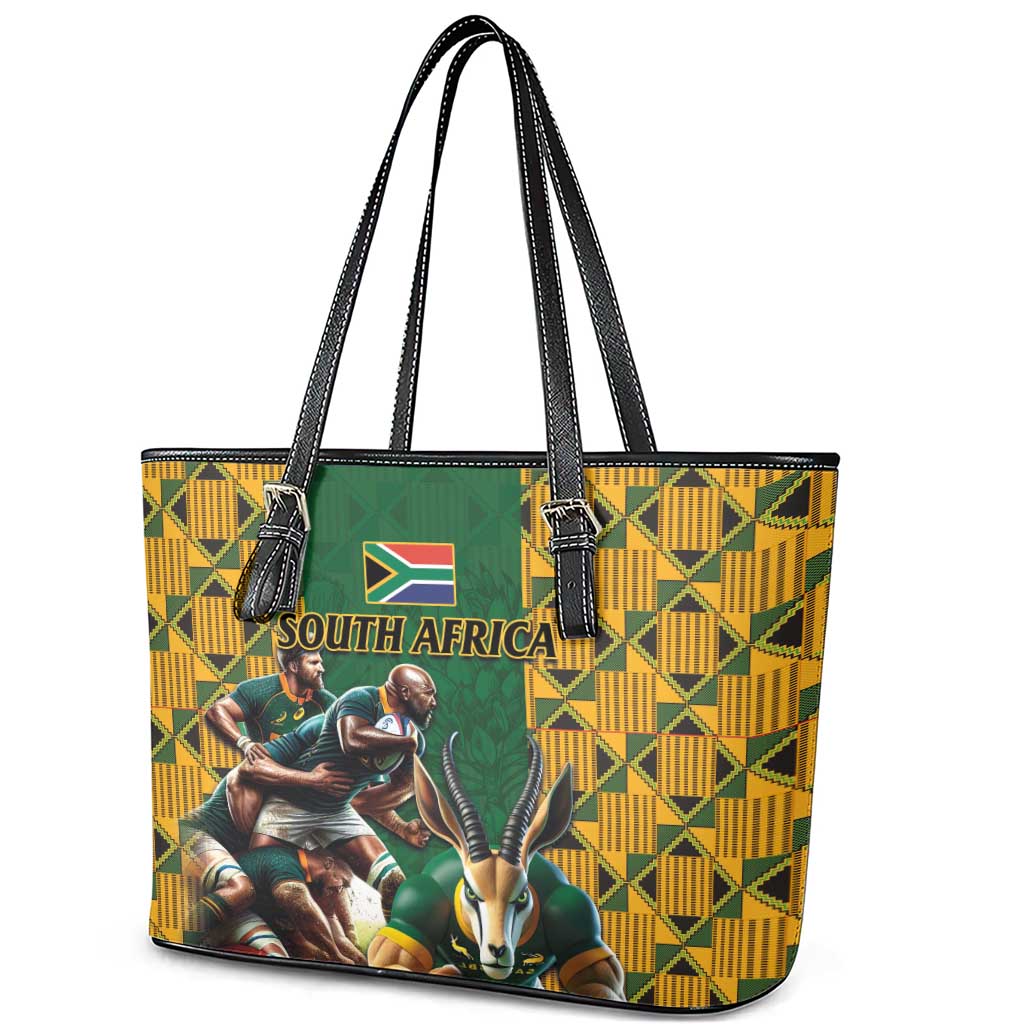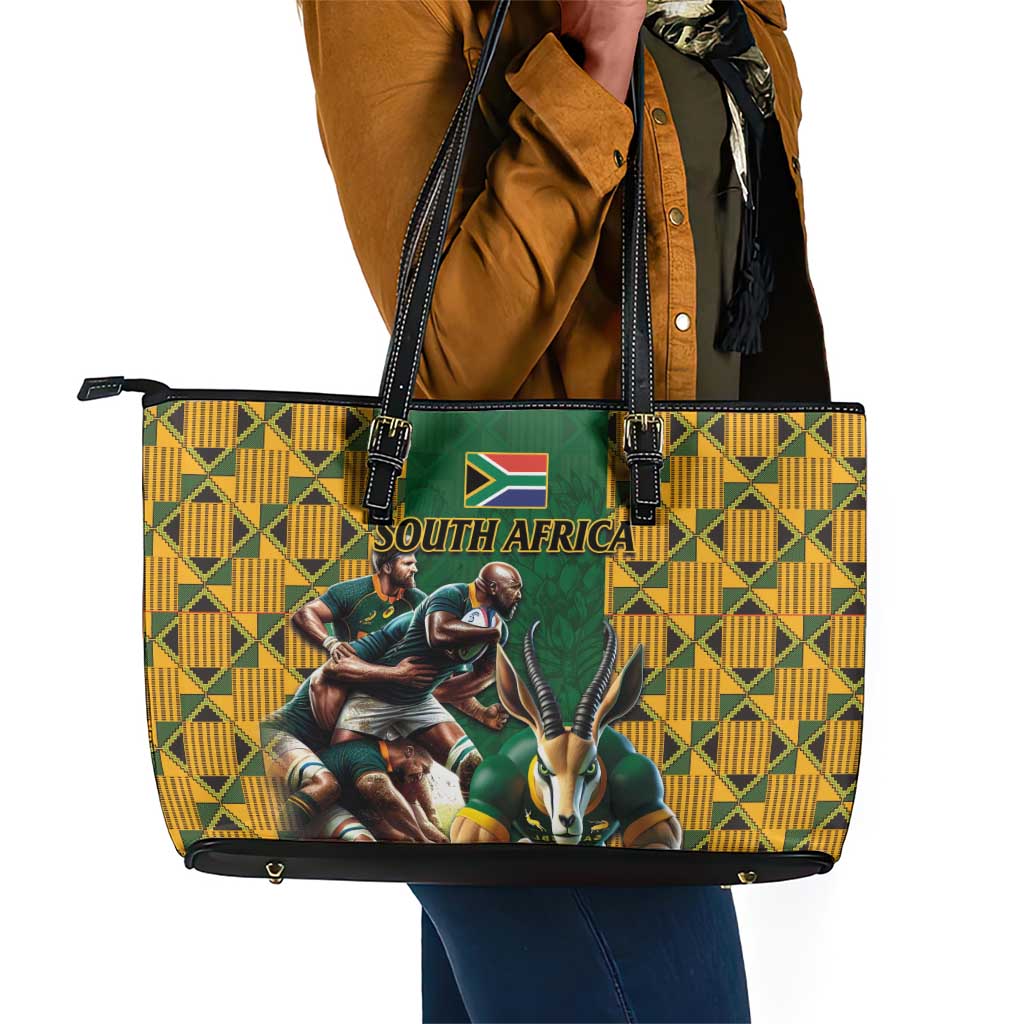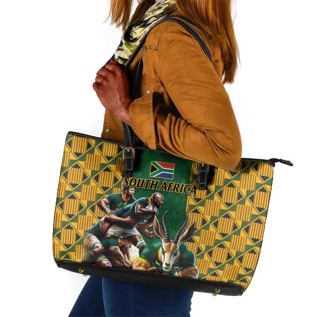 South Africa Rugby Leather Tote Bag - Springbok Mascot, Players Fighting for Victory