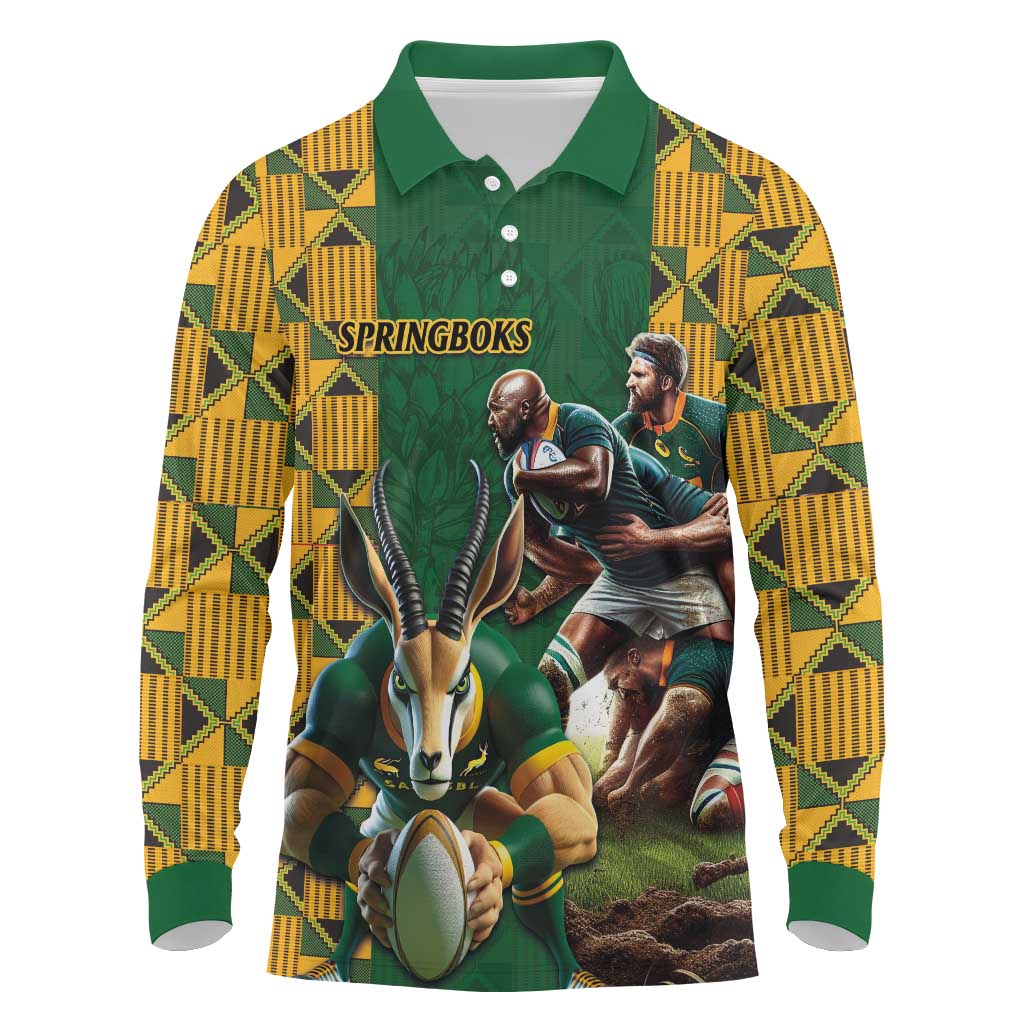 South Africa Rugby Long Sleeve Polo Shirt - Springbok Mascot, Players Fighting for Victory