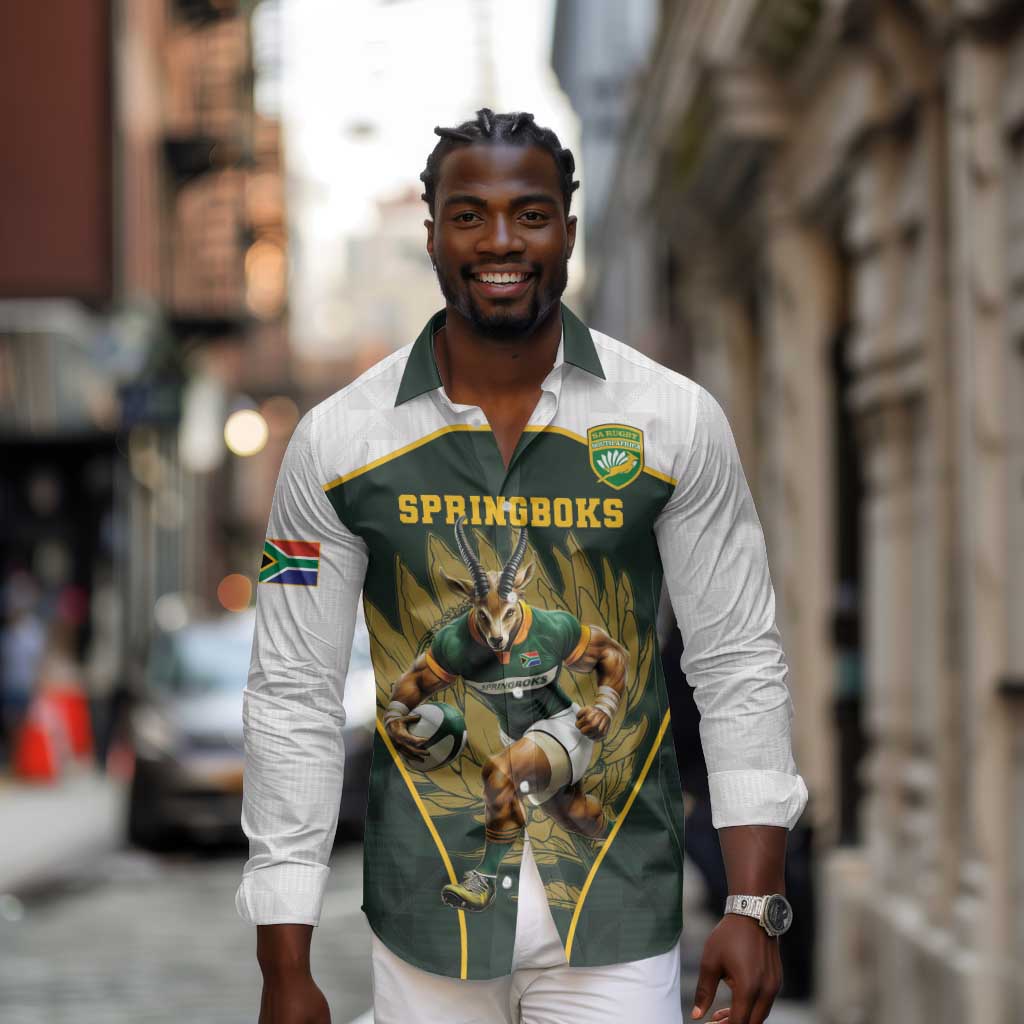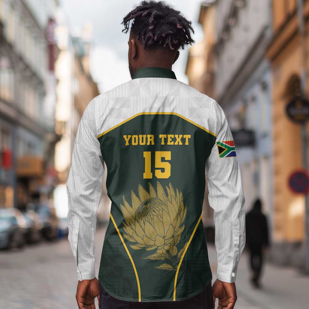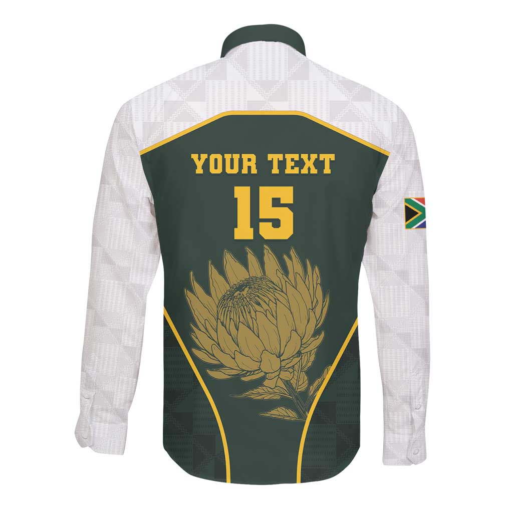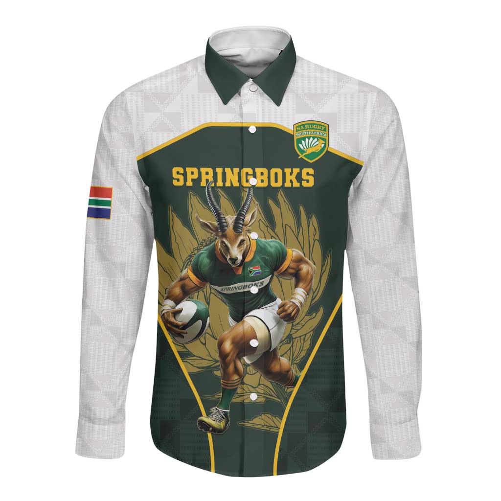 South Africa Rugby Personalised Long Sleeve Button Shirt Springboks Mascot With King Protea - African Pattern