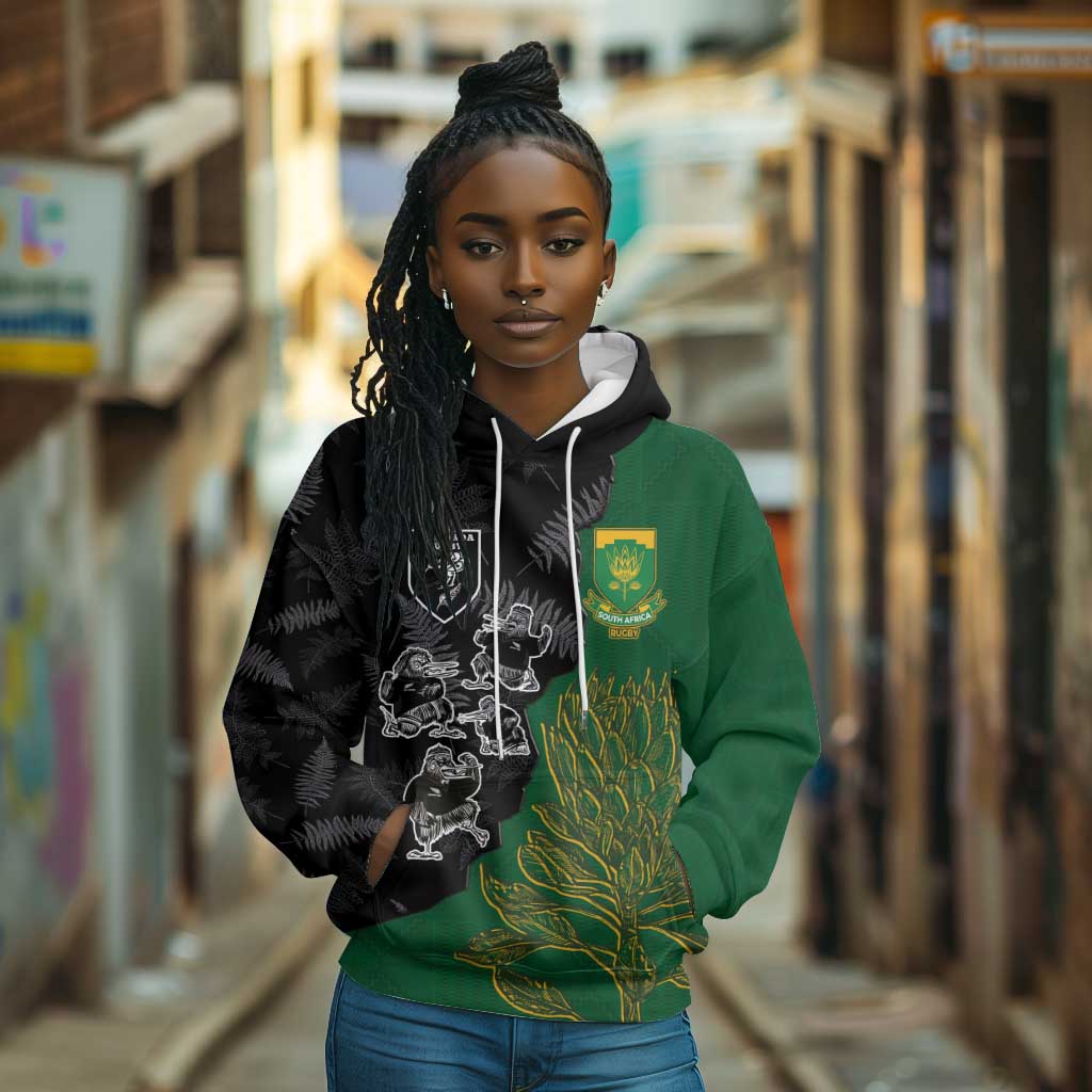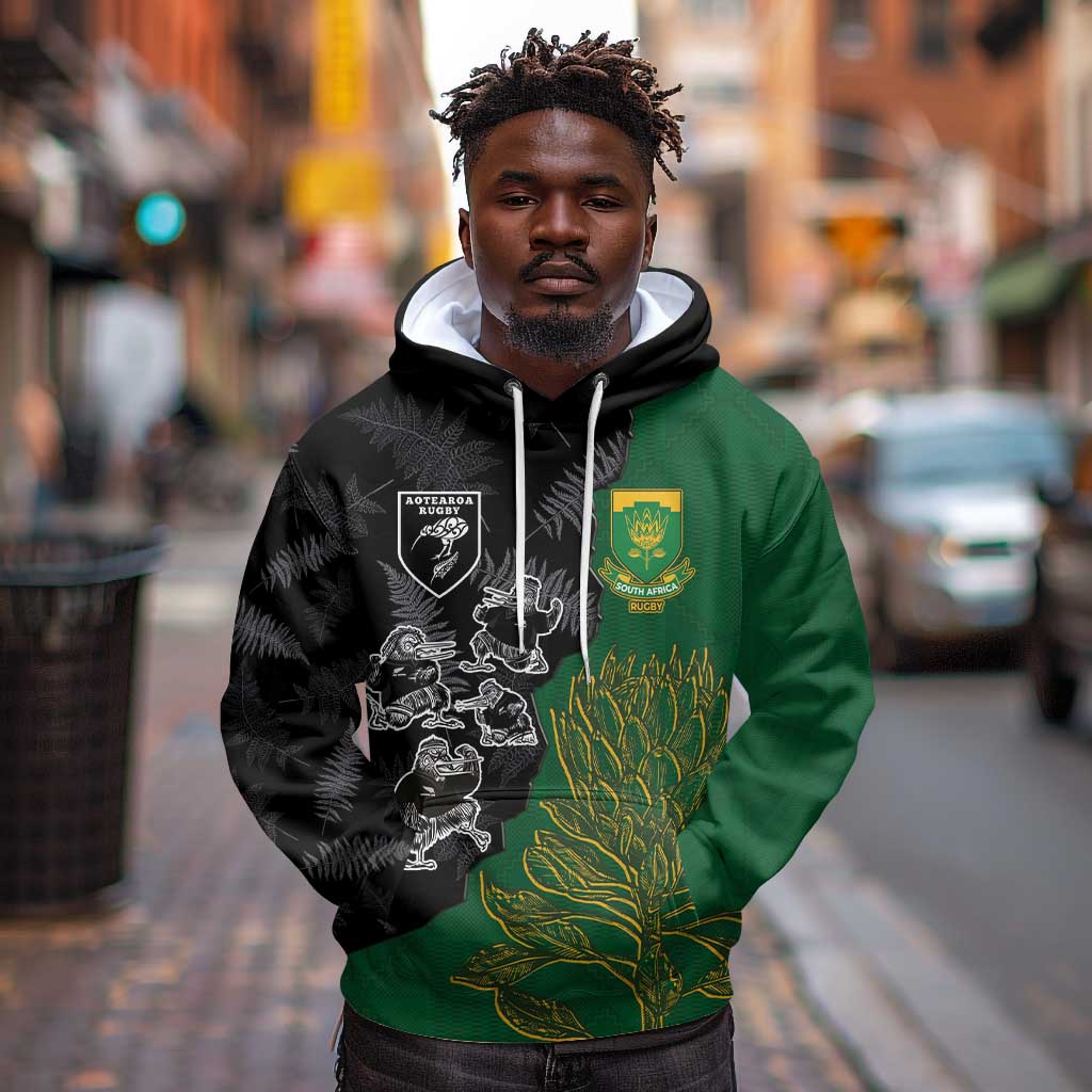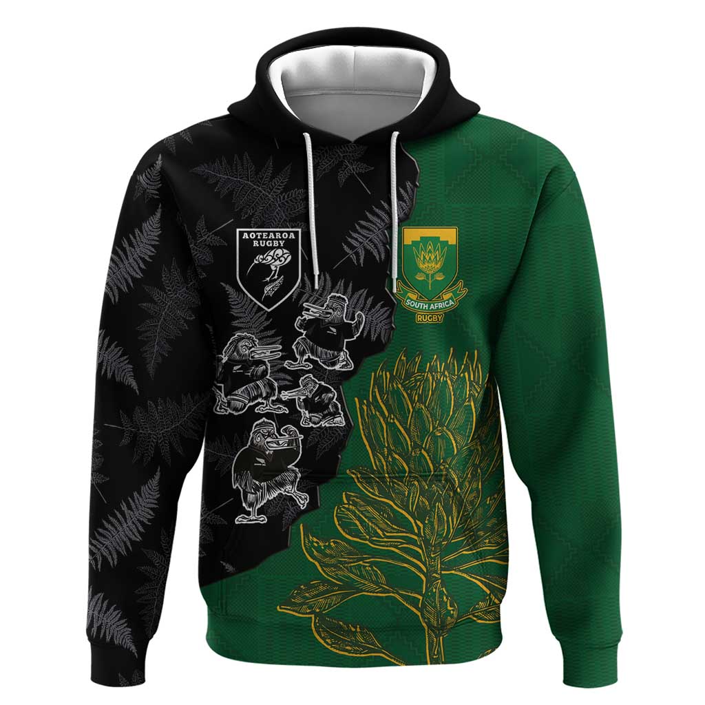 Custom Aotearoa South Africa Rugby Freedom Cup Hoodie Kiwi Warriors Haka with King Protea Symbol