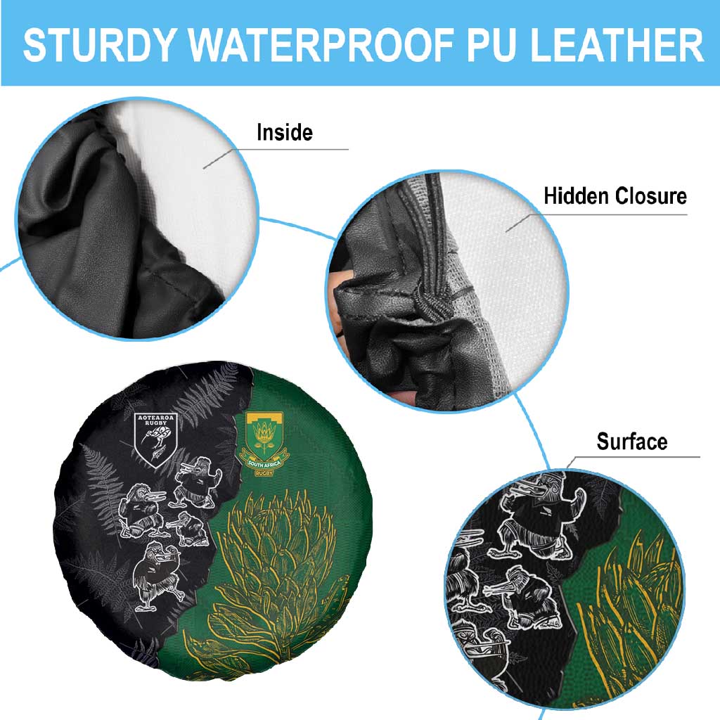 Aotearoa South Africa Rugby Freedom Cup Spare Tire Cover Kiwi Warriors Haka with King Protea Symbol