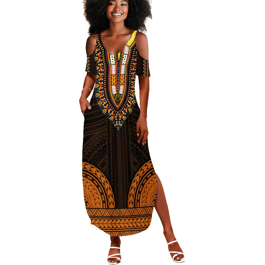 African Dashiki and Polynesian Pattern Summer Maxi Dress Gold