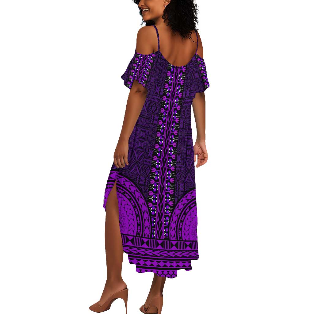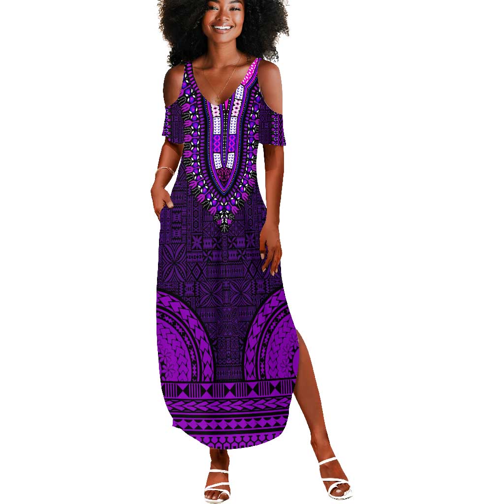 Purple Dashiki and Tapa Pattern Summer Maxi Dress Africa-Polynesia Together Culture