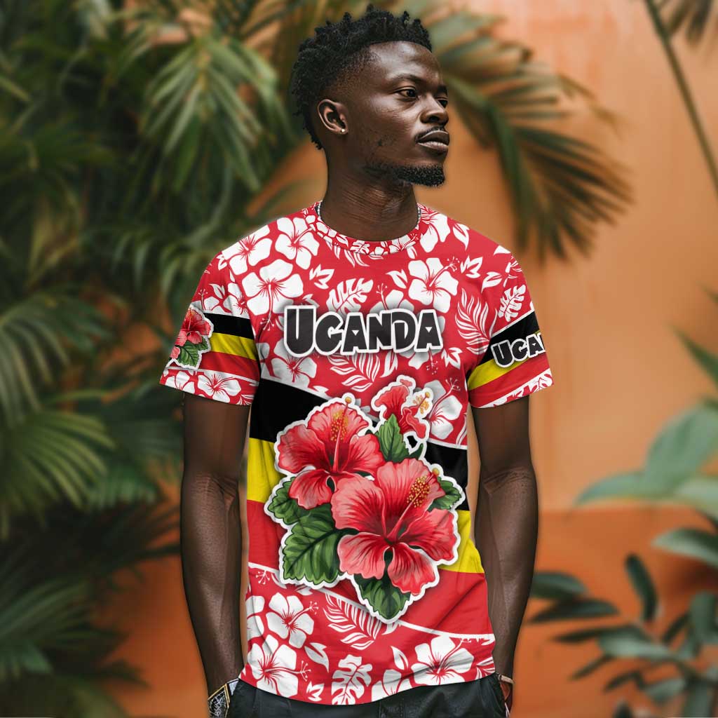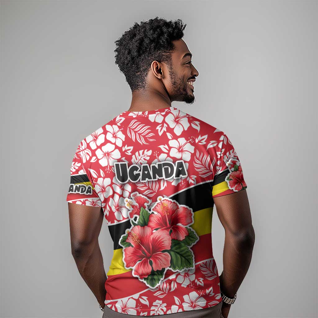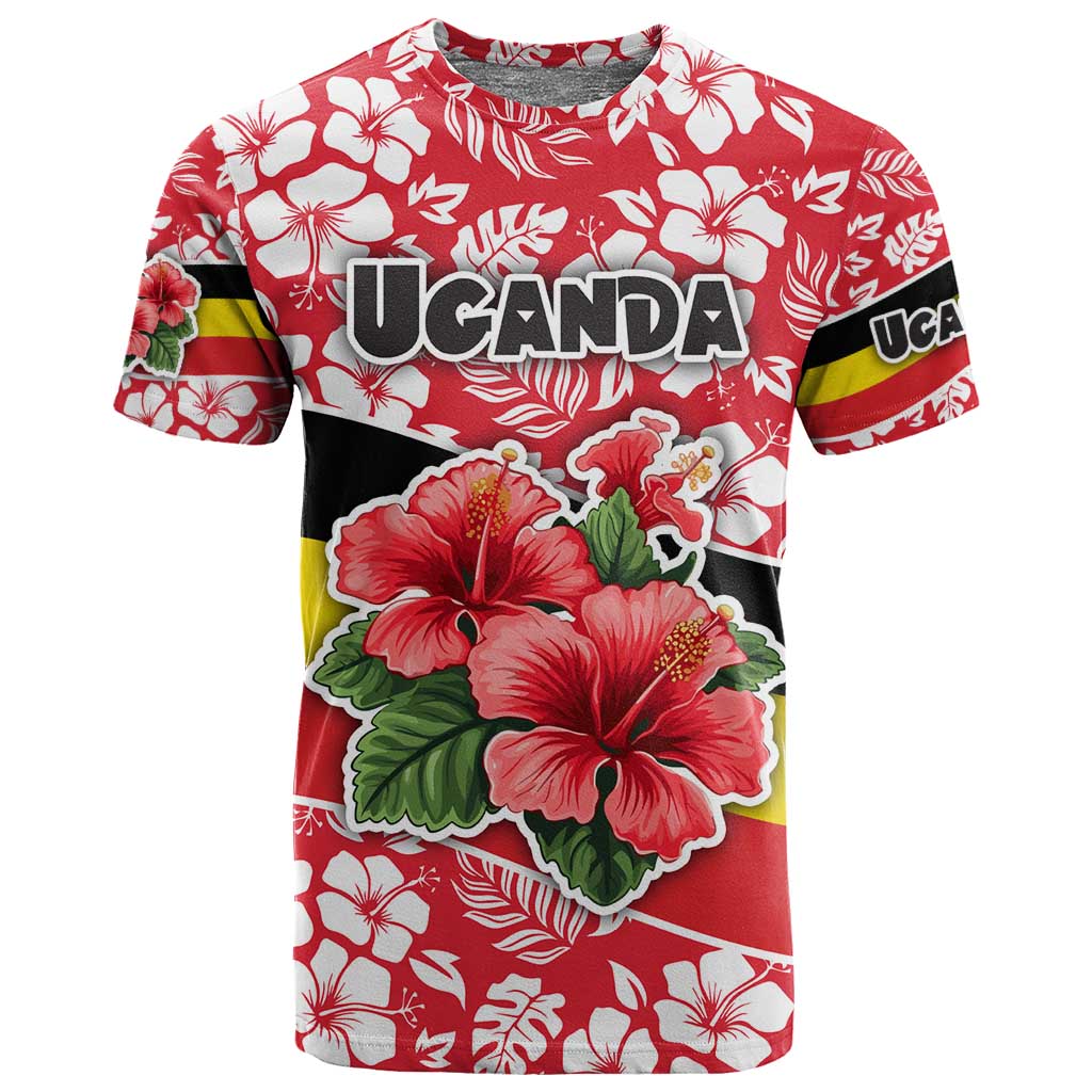 Uganda T shirt - Red Hibiscus Flowers and National Flag Design