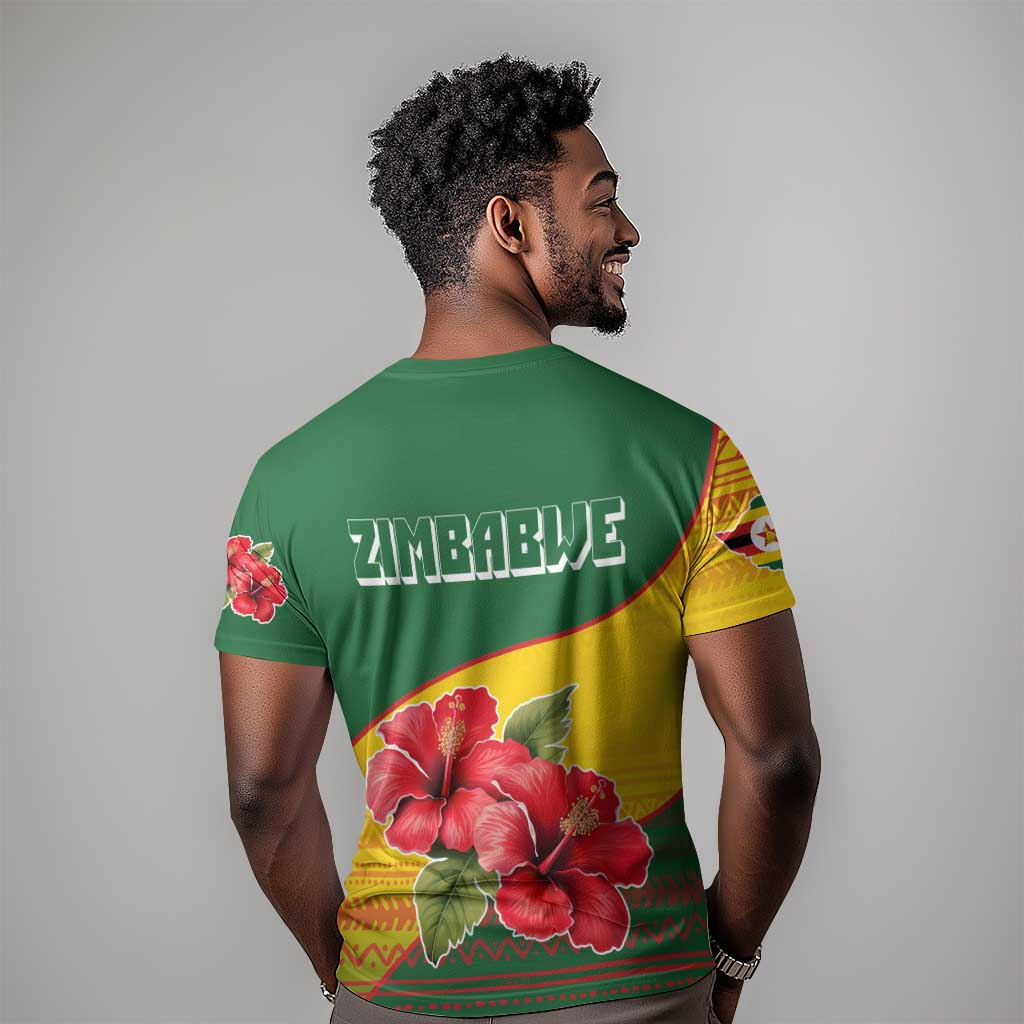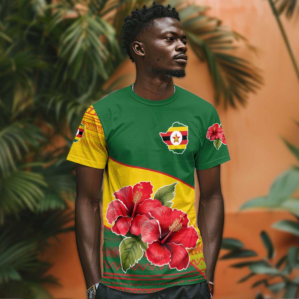 Zimbabwe Flag Map T shirt African Tribal Pattern Red Hibiscus Flowers