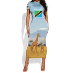 Tanzania Safari Giraffe Short Sleeve Bodycon Dress - Tribal Patterns and Mount Kilimanjaro Scene