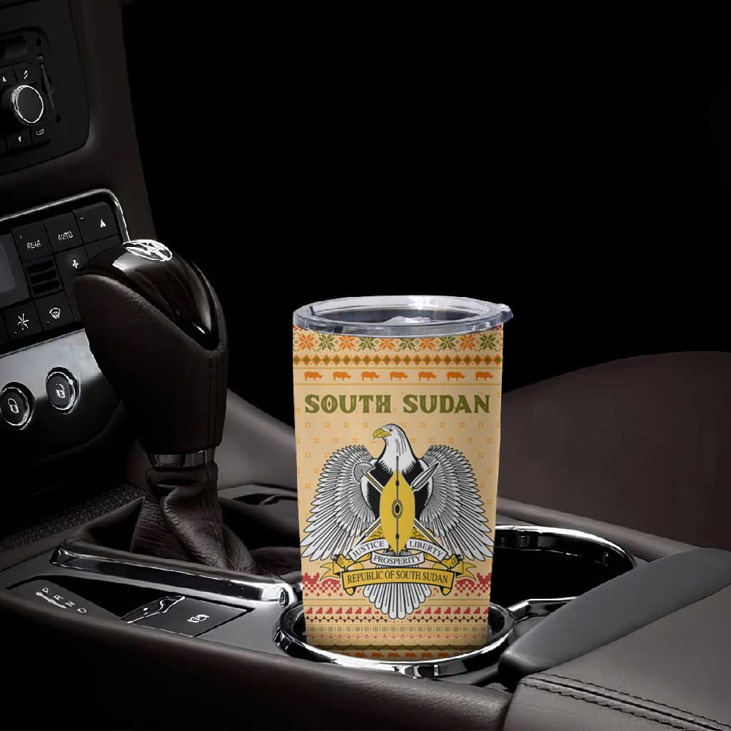 South Sudan Christmas Tumbler Cup Beige Tribal Pattern, National Emblem, and Green Star Motif