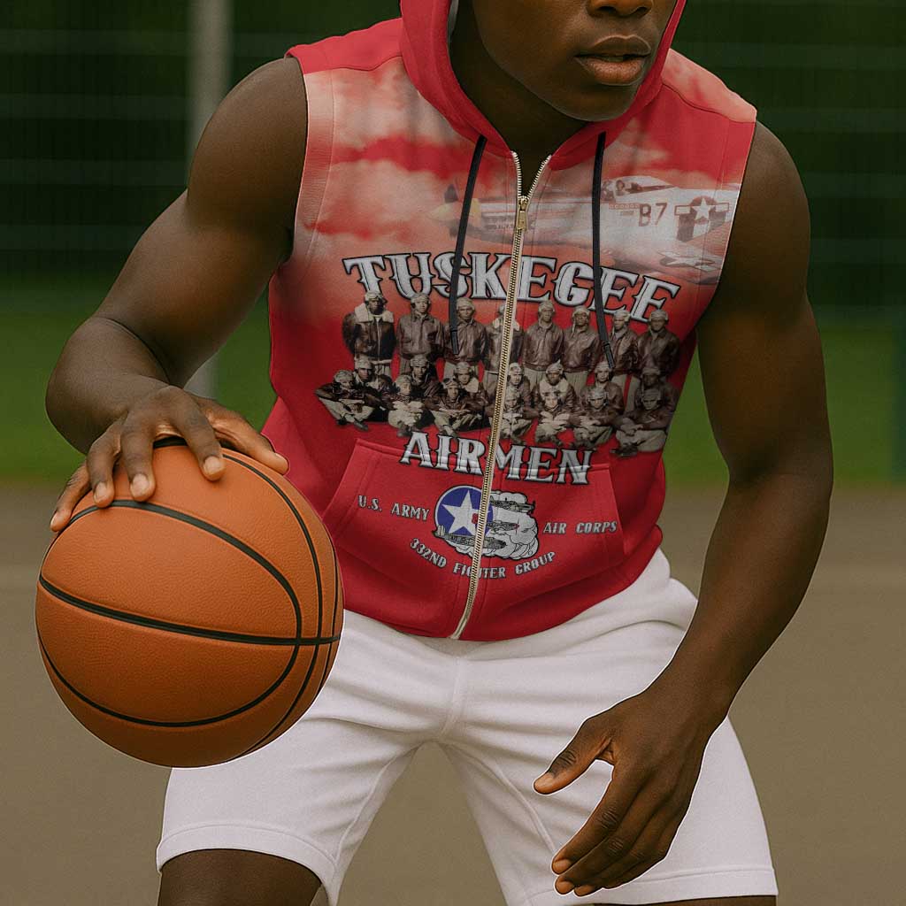 Remembering the Red Tail Heroes Sleeveless Zip Hoodie Tuskegee Airmen Legacy - Red LT15