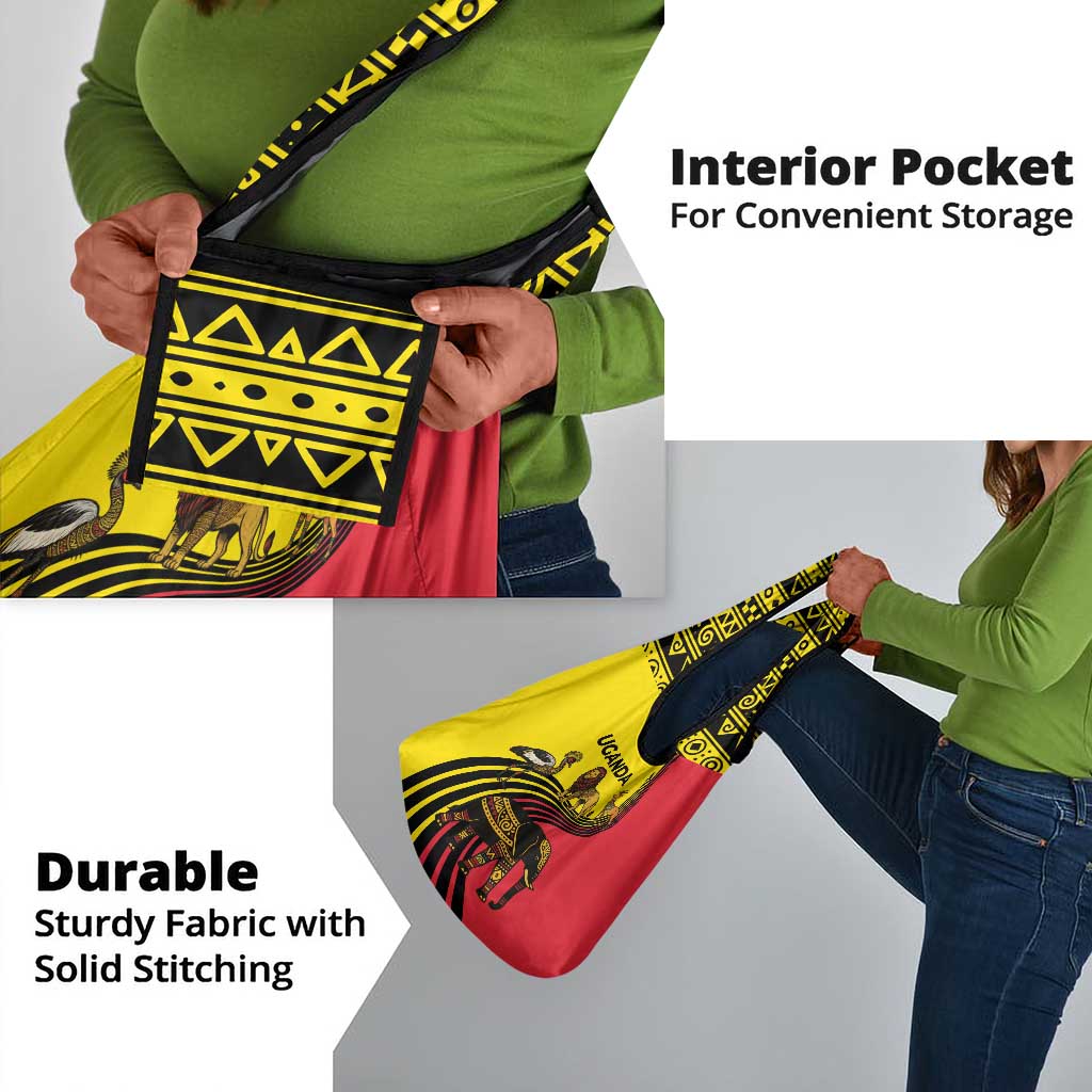 Uganda Grocery Bag - African Wildlife Elephant Lion and Crane in Tribal Pattern Design