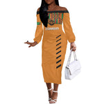 Custom Zambia Football Off The Shoulder Long Sleeve Dress Copper Queens Kente Pattern