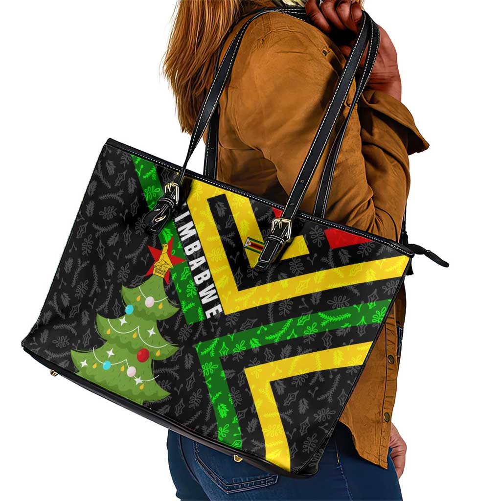 Zimbabwe Christmas Leather Tote Bag Flag Colors Xmas Tree and Holiday
