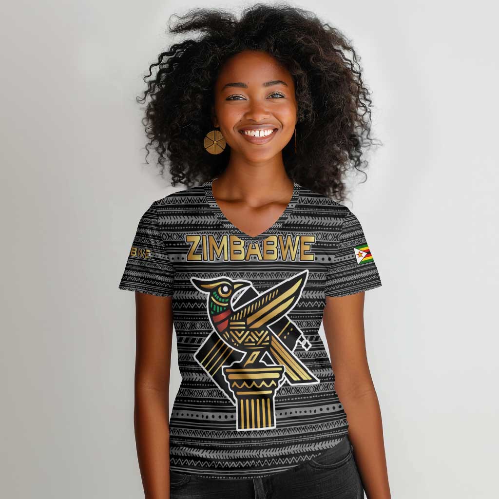 Zimbabwean Bird Statue Women V-Neck T-Shirt Tribal Pattern Flag Patch and Heritage Symbol